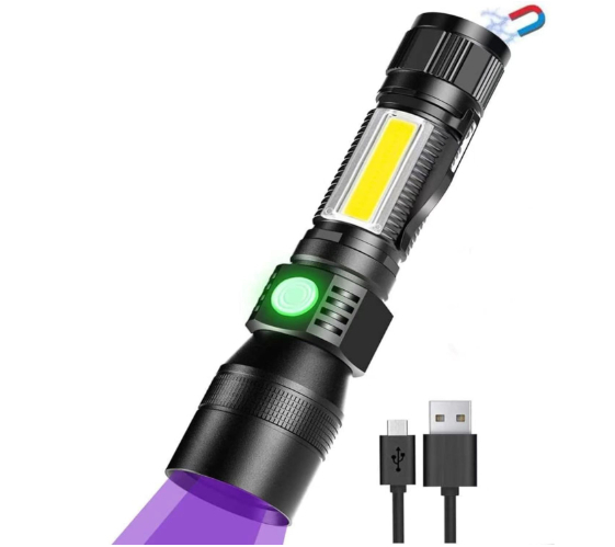 Portable flashlight with 3 lighting modes: high, low, COB side light.