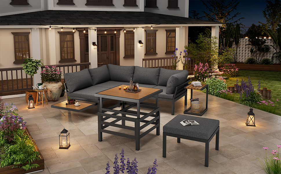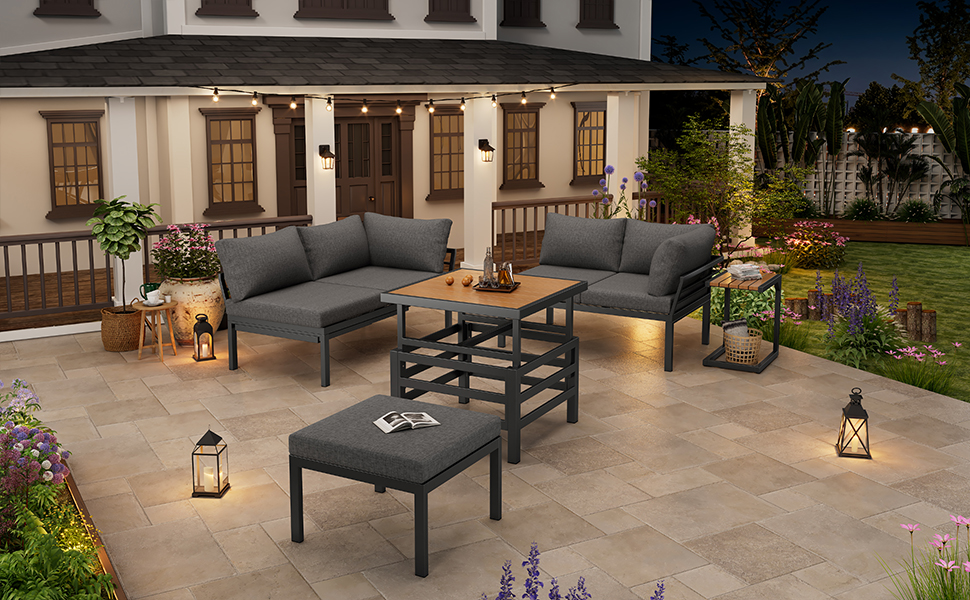 • Modern Outdoor Patio Furniture Set:This outdoor patio furniture set consists of 2 double sofas, 1 ottoman, 1 height-adjustable plastic-top coffee table, and a small side table. The design of this outdoor furniture combines modern aesthetics with a vintage charm. Your comfort is our priority. The ergonomically high backrest and 10 cm deep seat promote correct posture and relaxation.