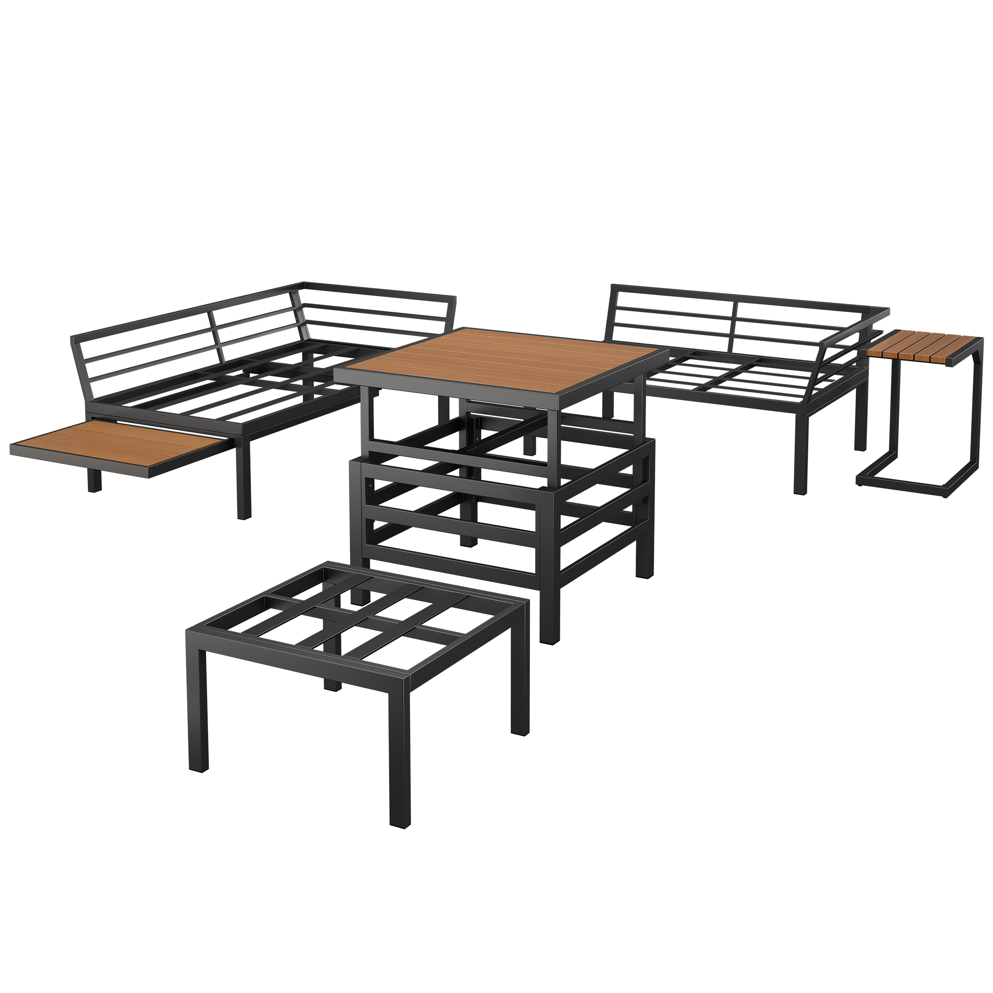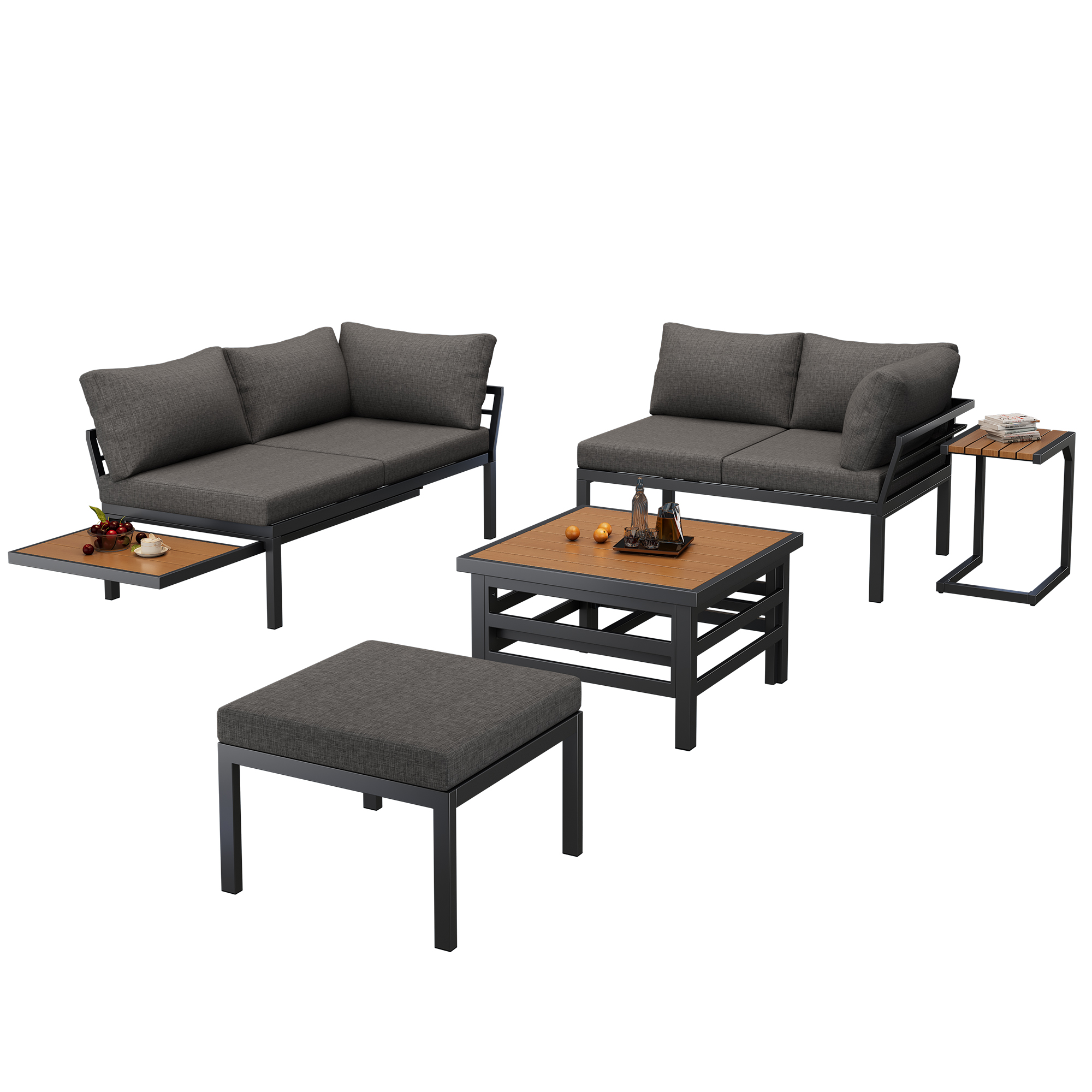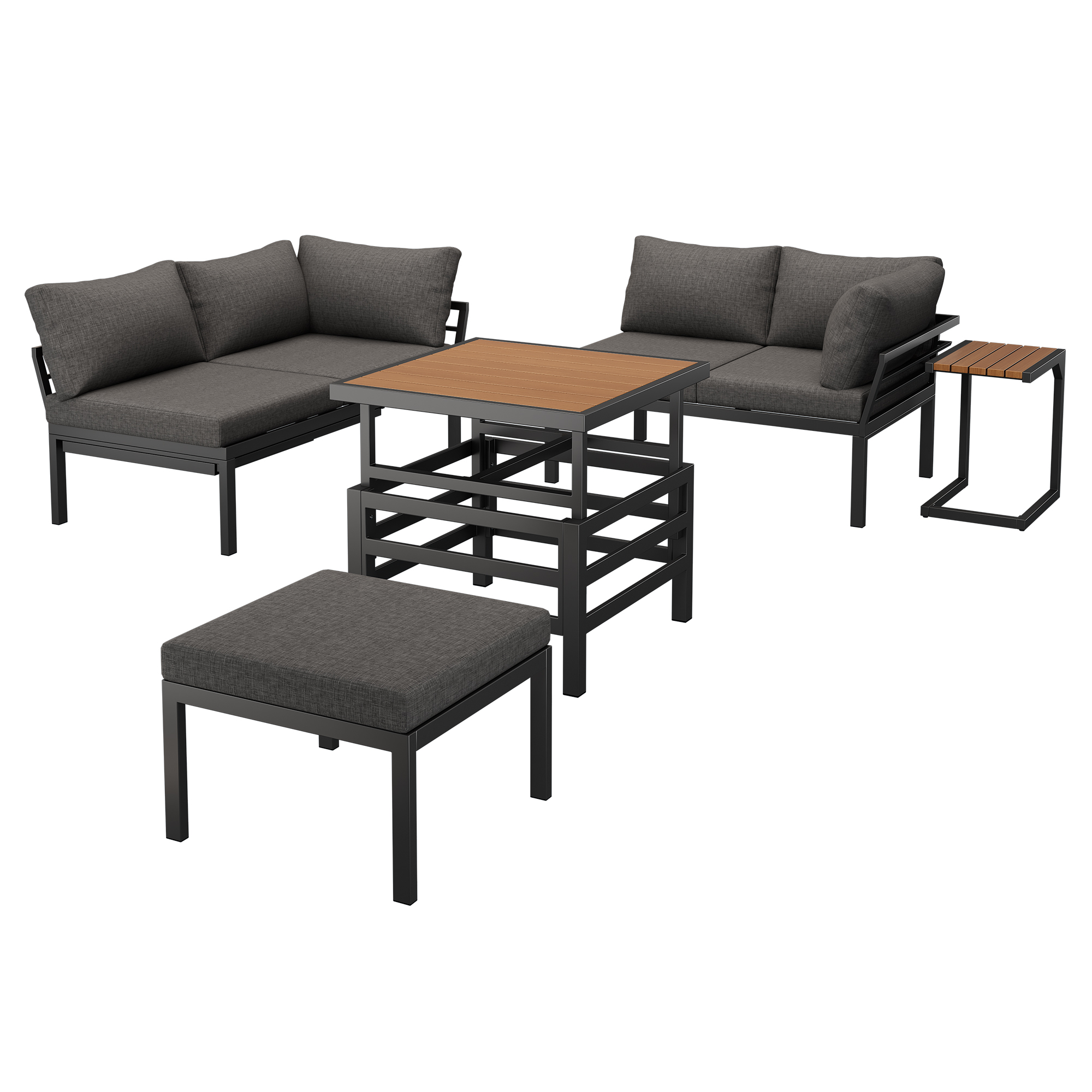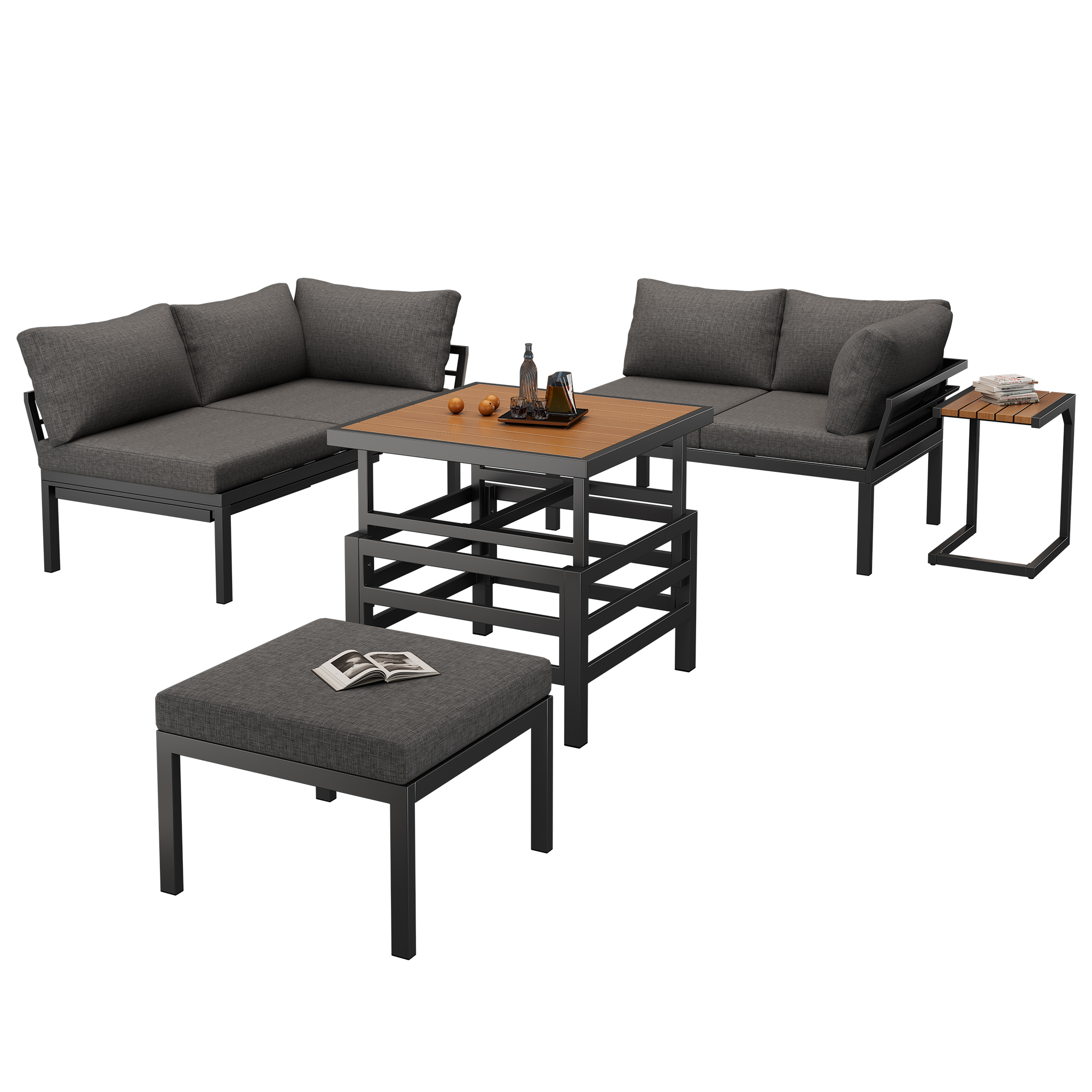 Product Name:Outdoor Patio Furniture Set (2 Double Sofas + 1 Ottoman), 1 Plastic Lift-Top Coffee Table, Galvanized Iron Frame, with Seat Cushions & Pillows, Includes Small Side Table with Extendable Tabletop