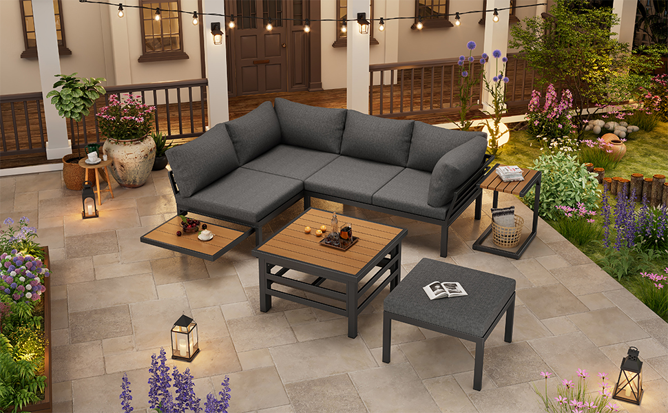 • Rich in Details:The small side table features adjustable feet, ensuring it stands stably even on uneven ground. The small table under the double sofa is retractable and can be pushed under the sofa to save space when not in use. The entire set includes 4 seat cushions (10 cm thick) and 6 backrest cushions, providing comfort and warmth.