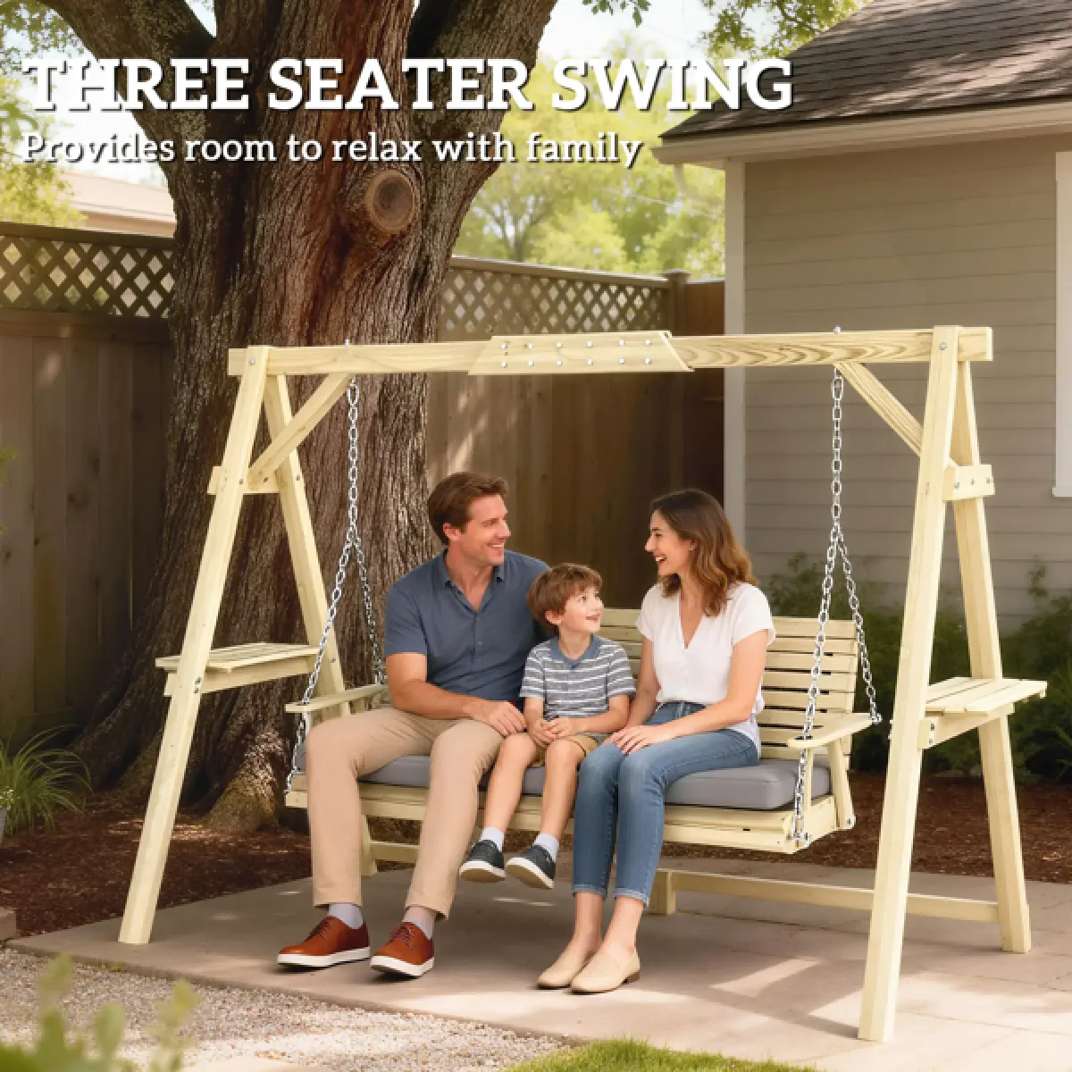 Features: - Ergonomic design offers a supportive and pressure-relieving seating experience - Thick padded cushion ensures long-lasting outdoor relaxation and comfort - Built-in side shelves provide handy storage for drinks or items - Removable polyester cushion allows for easy cleaning and maintenance - Adjustable chain system customises seat height and swing angle effortlessly - Safety carabiners ensure stable and smooth swinging for added security - Fir wood frame with varnish resists moisture, cracking, and outdoor wear - Solid wood structure supports up to 880 lbs for reliable durability. Specification: - Color: Natural Wood - Material: Fir Wood - Overall Dimension: 95.7" W x 52.8" D x 66.9" H - Cushion Dimension: 55.9" L x 16.1" W x 2.4" T - Seat Dimension: 60.2" W x 24.8" D x 20.9" H - Seat Height: 16.1" -23.2" - Back Dimension: 17.7" W x 55.9" L - Side Tray Dimension: 20.5" L x 8.7" W - Weight Capacity: 726 lbs
