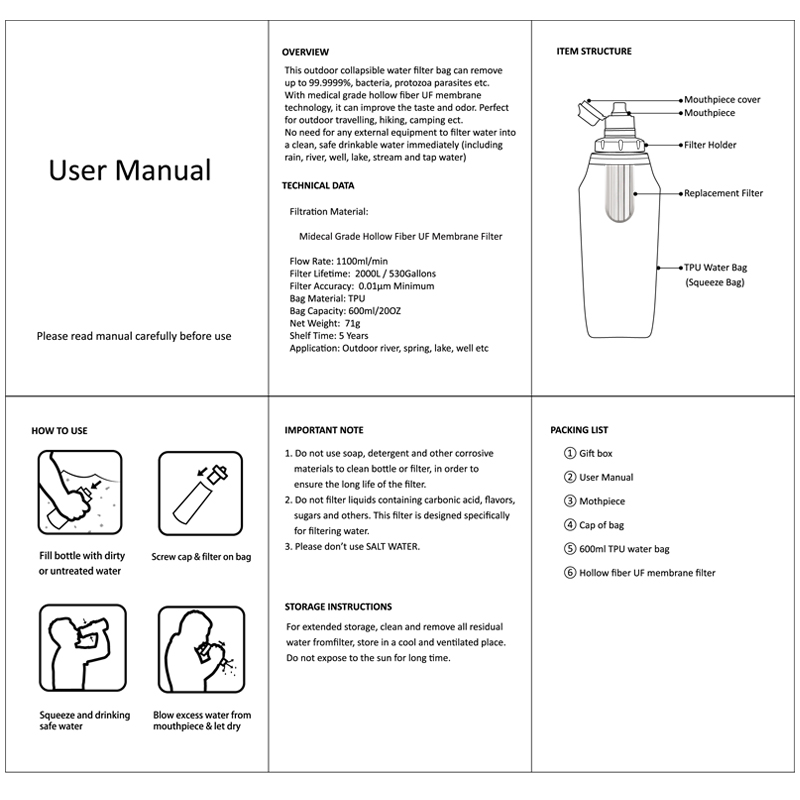Hollow fiber membrane water filters remove bacteria and protozoa from lakes and streams to ensure safe and clean drinking water. Removing 99.99% of aquatic bacteria and 99.9% of protozoa, carbon fiber can remove odor and residual chlorine from water, improving the taste of water without the use of chemicals, iodine or batteries. Comfortable silicone nozzle with leak-proof cap. Filters up to 2000 liters of water down to 0.01 microns with fast flow rates up to 1100 ml per minute. Great for travel, outdoor adventures, emergency preparedness, hiking, backpacking, camping, survival. Specifications: Material: TPU Filter life: 2000L Filtration accuracy: Minimum 0.01um Volume: 1100ml/min