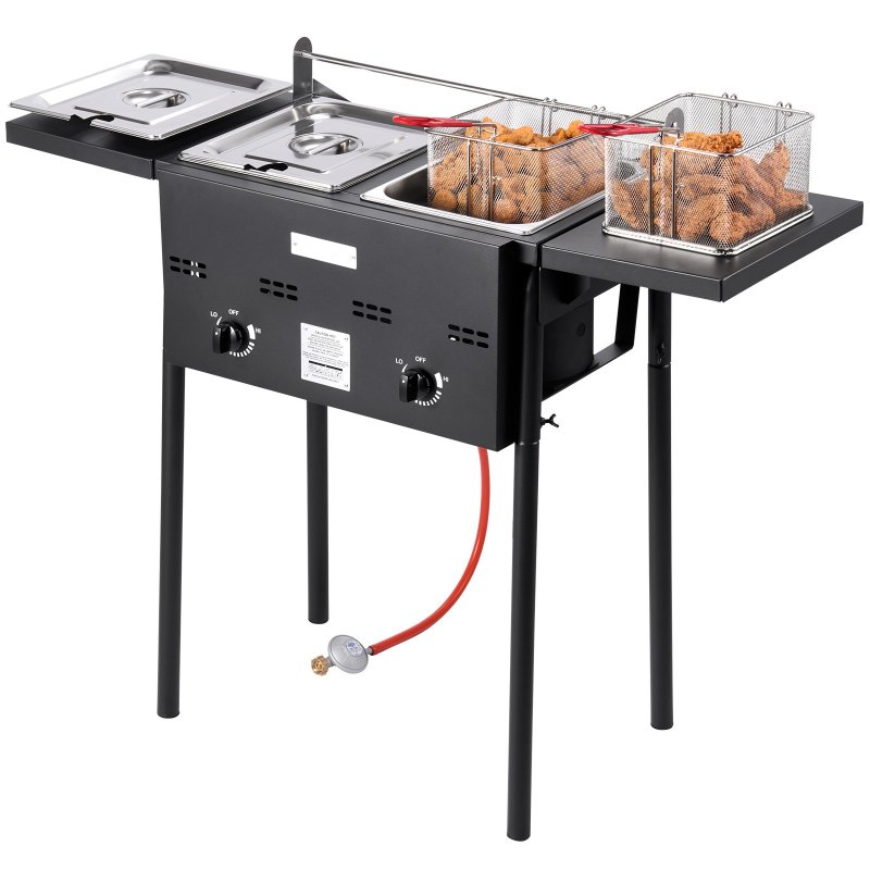 4Gal Dual Stainless Tanks: This outdoor propane fryer has total 16 QT / 4 Gal capacity with clear max fill line – please do not overfill to avoid spills. Ideal for frying many foods simultaneously at outdoor gatherings – durable and easy to clean