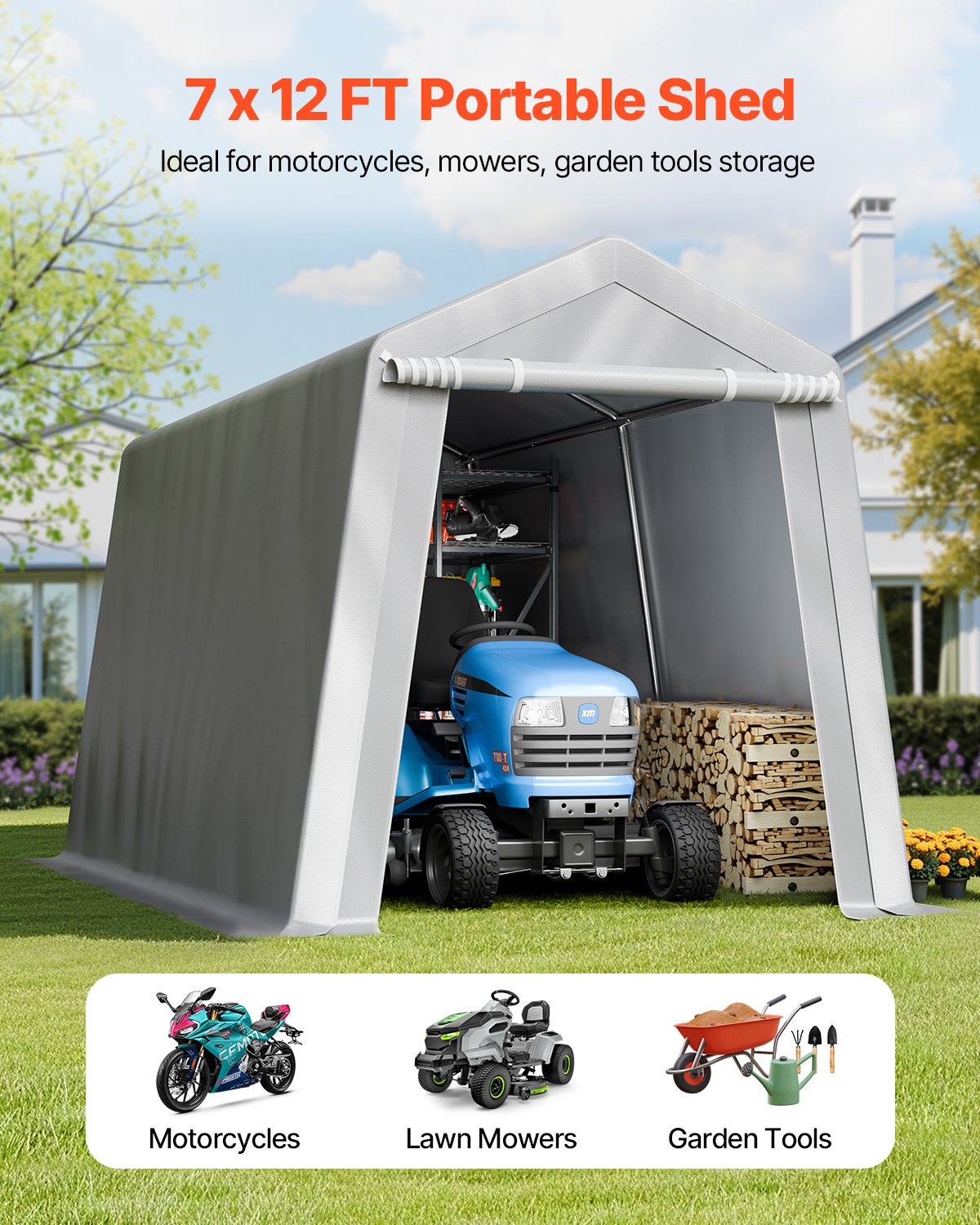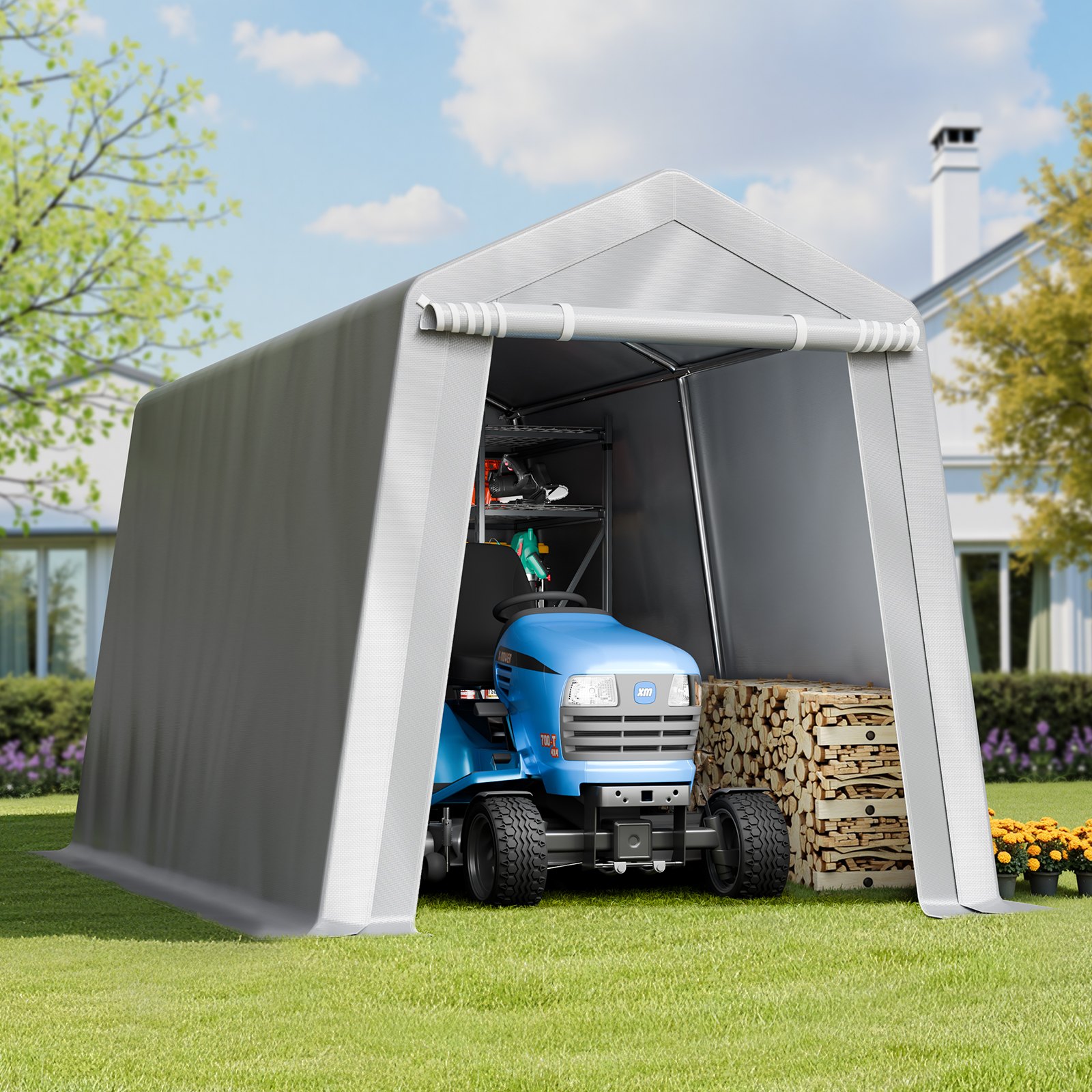 Zipper Door Design: Flexible to seal or roll up. When sealed, the zipper fits snugly, fully protecting your items from dust, moisture, and other external factors. To access your items, simply roll up the zipper door for easy and quick access to your canvas storage sheds.