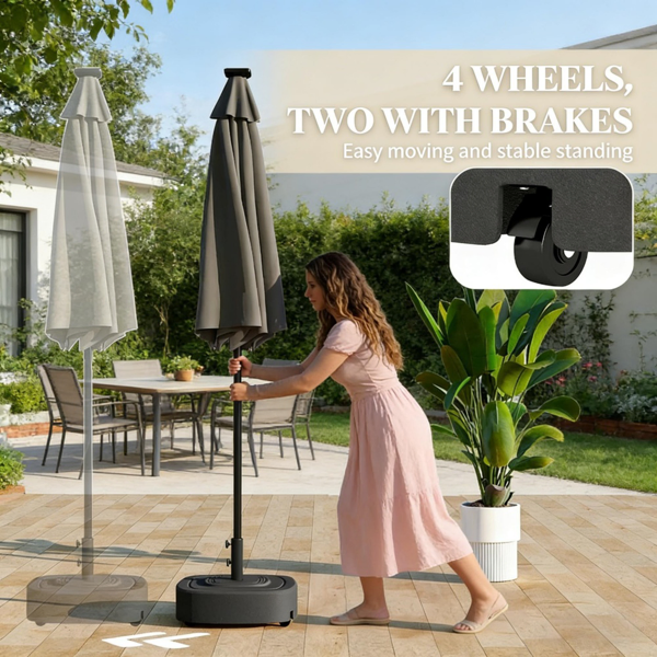 Features: - Features four wheels with two brakes for effortless moving around your poolside - Fill with 110 lbs. of sand or 86 lbs. L of water for excellent outdoor stability - This umbrella base fits umbrellas up to 13.1' and double-headed styles - The steel tube accommodates both 1.5" Dia. and 1.89" Dia. umbrella poles securely - Made from high-quality HDPE and powder-coated steel for long-lasting outdoor use - A chic black wood grain finish enhances your patio's modern appearance - Assembly required Specification: - Color: Black - Materials: HDPE, Metal - Overall Dimensions: 22.4" L x 22.4" W x 15" H - Bottom Base Size: 22.4" L x 22.4" W x 6.3" H - Pole Size: 2.2" Dia. x 14" H - Weight After Filling: 110 lbs. (sand), 86 lbs. (water) - Fits Umbrella Pole: 1.5" Dia. , 1.89" Dia. Attention: This product only has a base Package Includes: - 1 x Umbrella Base - 1 x Manual