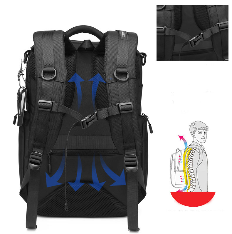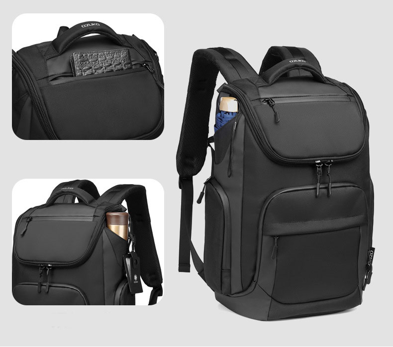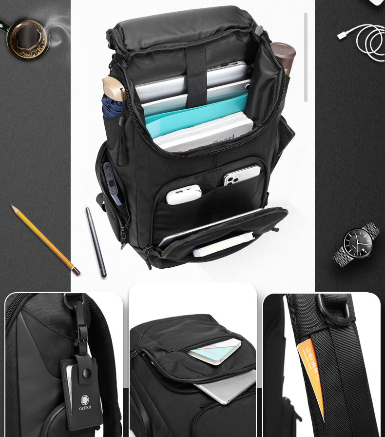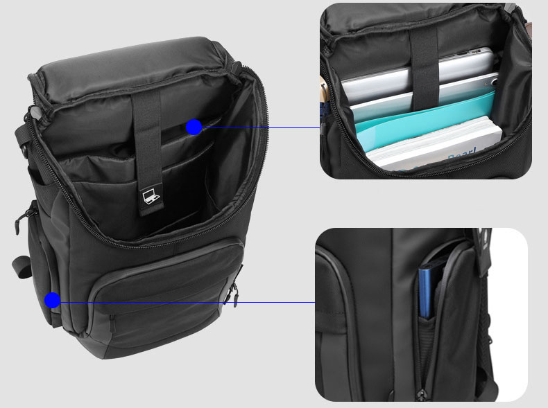 Internal structure of the bag: zipper pocket, mobile phone pocket, ID pocket, laminated zipper pocket, computer pocket and camera pocket.