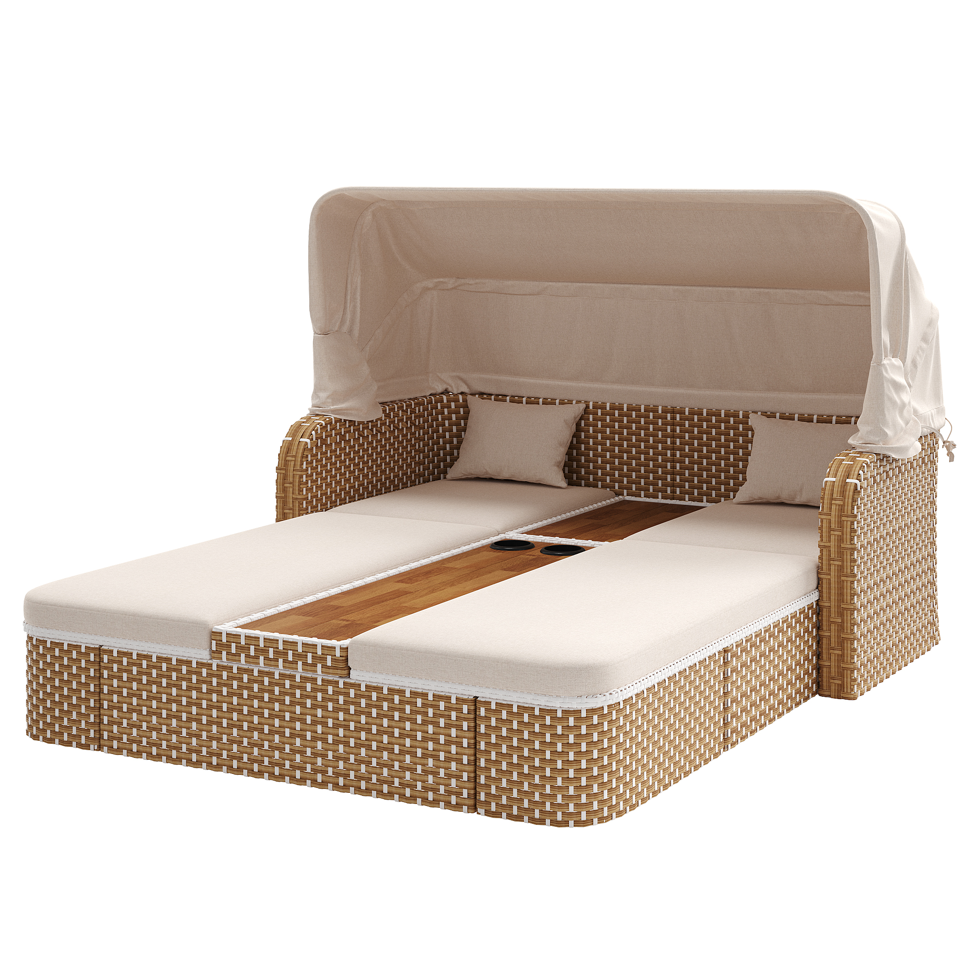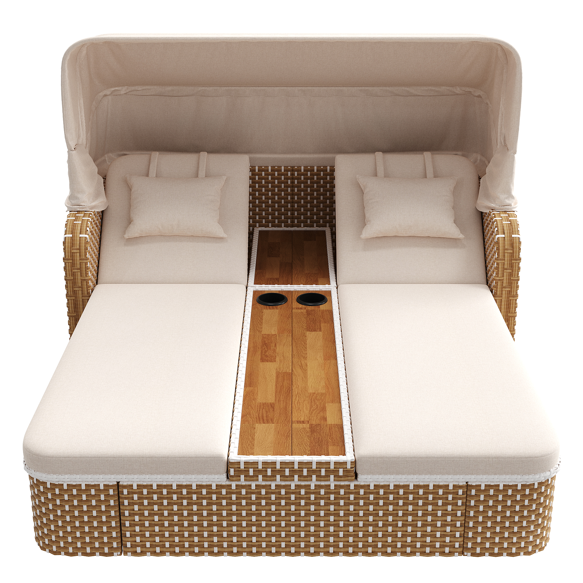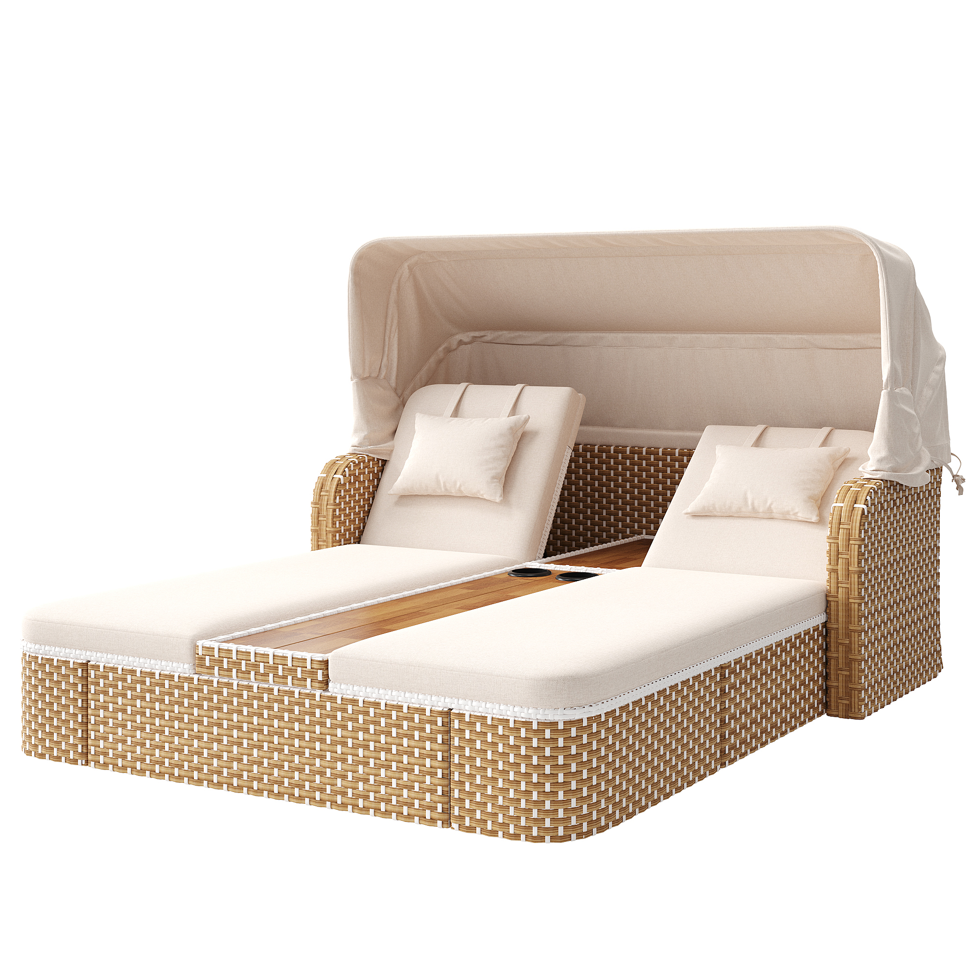 Product Name:Outdoor Wicker Double Chaise Lounge with Adjustable Canopy, 5-Position Reclining Backrests, Built-in Cup Holders, for Patio & Poolside