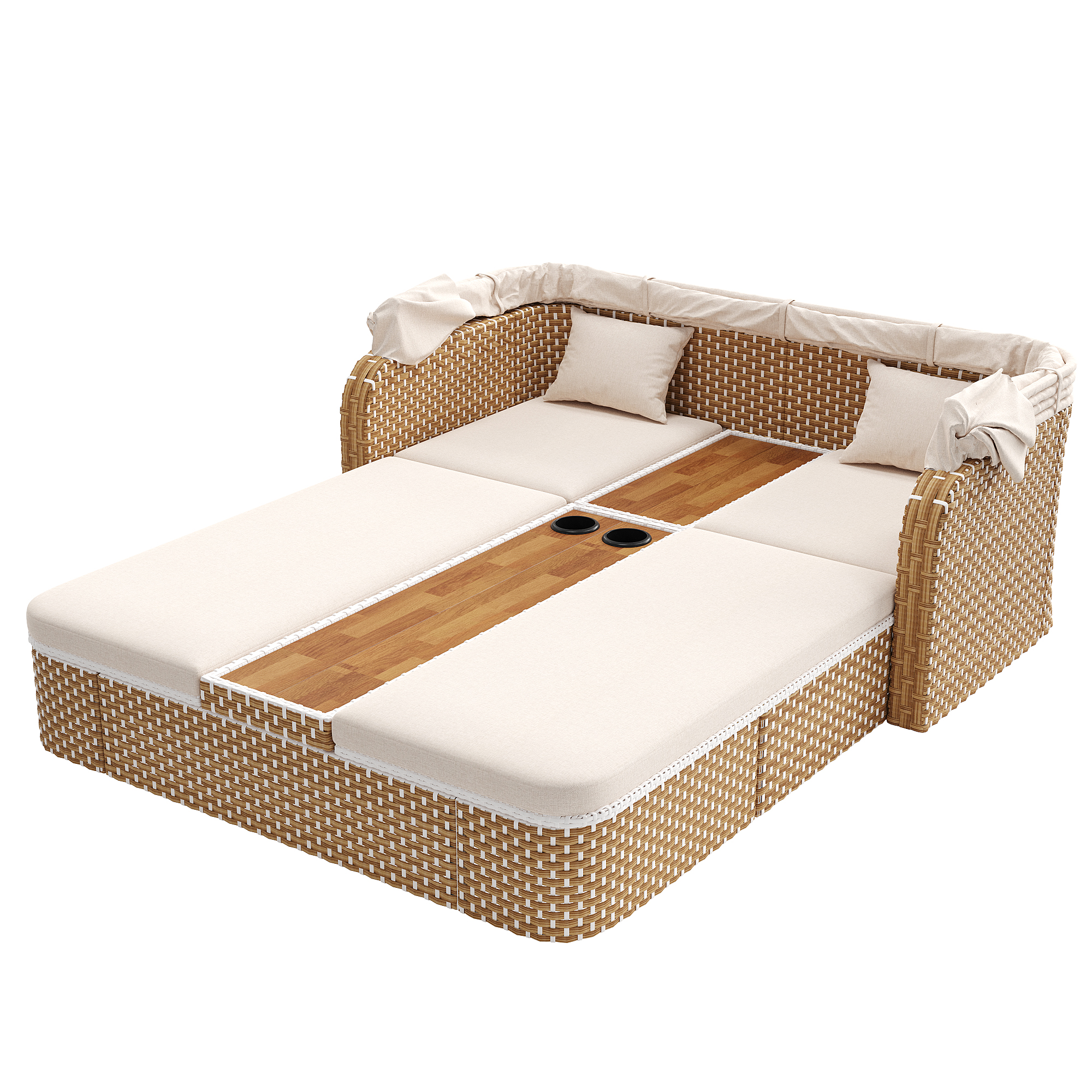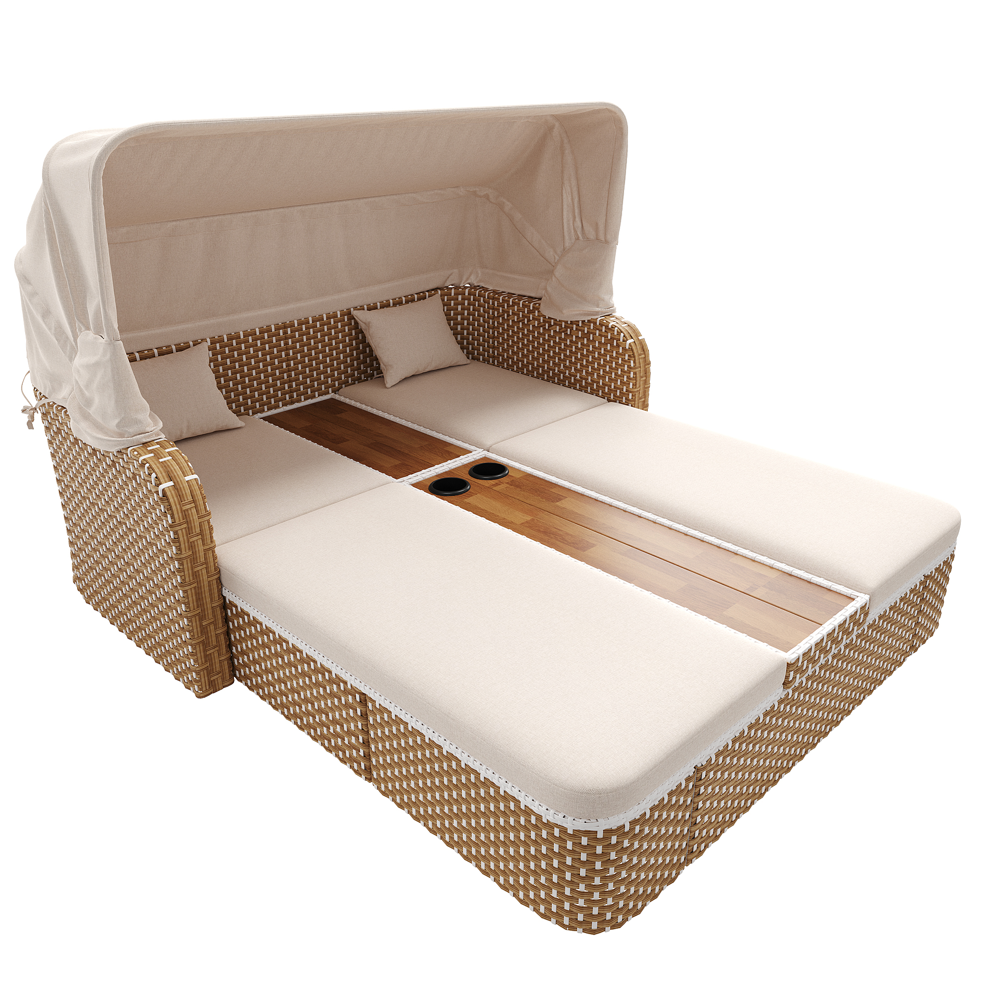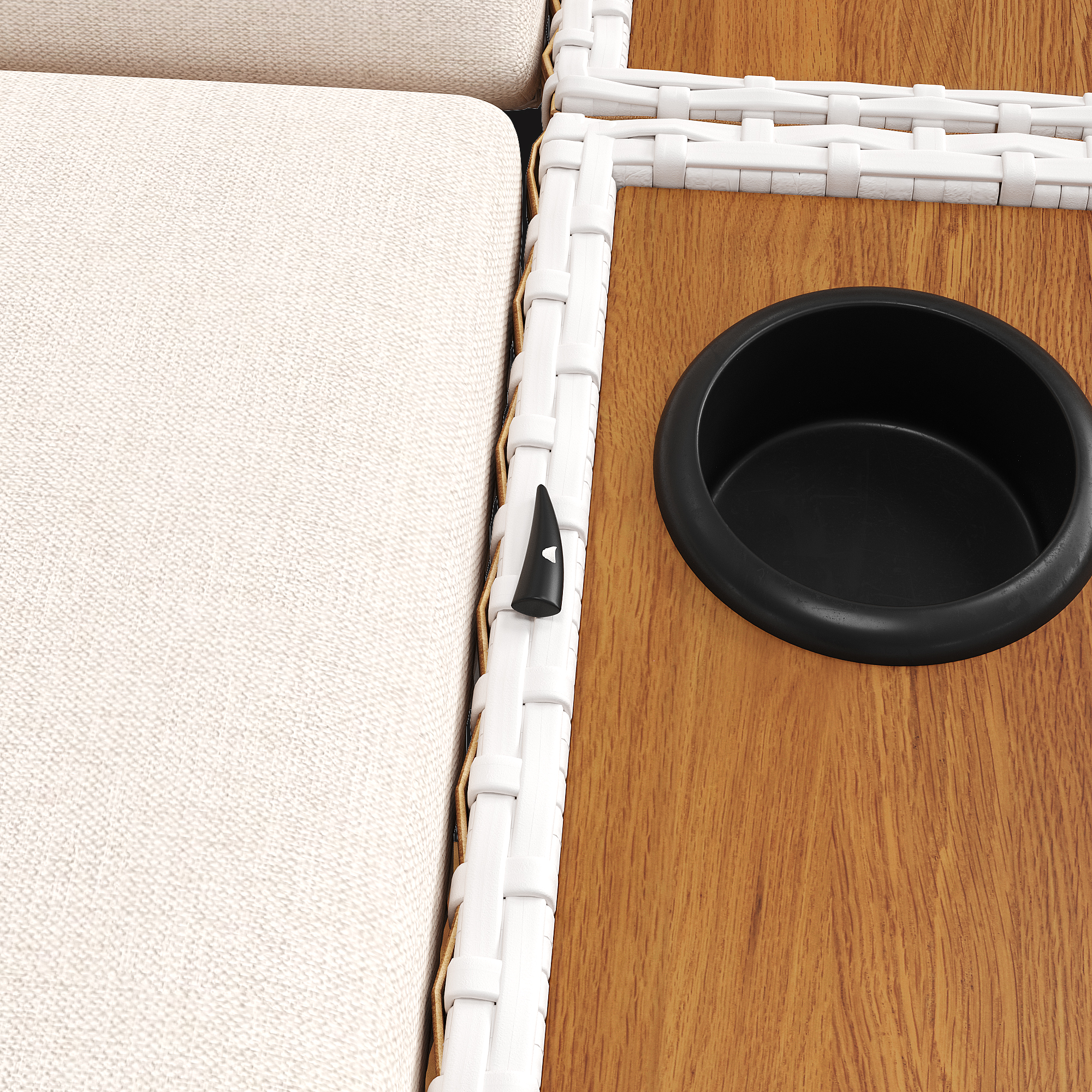 The openable canopy can be adjusted to open or close depending on the sunlight, providing shade when needed and combining functionality with comfort. The built-in beverage holder with two cup slots keeps your drinks within reach, while the strap design and seat cushion securing clips ensure everything stays in place. The sturdy wicker construction and solid wood tabletop in the center add durability and style, making this lounge a standout piece for your patio or poolside.