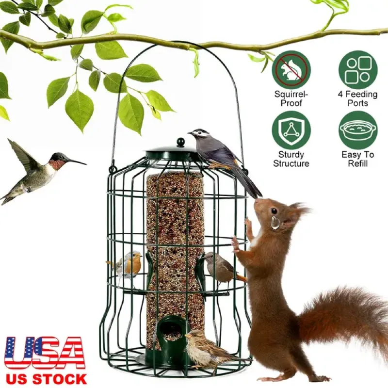 *Keep Unwanted Guest Away*:Well-spaced cage feeder is especially designed for various tiny figures of birds to come through,and narrow feeding port is suitable for bird’s beak to easily get grains inside. Effectively prevent annoyed unwanted guest,like squirrels or larger birds from overtaking the food. *4 Feeding Ports*:Equipped with 4 feeding ports,allow multiple birds to access food simultaneously. Standing rods provide a resting place like real branch for tired birds after long journeys. Wide opening avoid mildew,keep the grains fresh and dry. *Premium Material*:Made of sturdy metal structure and durable PC tube,can withstand different weather conditions,like rain,wind,snow,heat,frost,etc.,provide you long lasting service life. Besides,transparent tube is convenient for you to observe and refill the food. *Easy To Use*:Come with portable handle and platform bottom,you can securely hang this bird cage feeder on higher place or place it on flat surface. The top lid is easy to open and refill food. *Ideal Gift For Bird-Lover*:A practical feeder to attract chickadees,finches,blue birds,goldfinches,grosbeaks and many other birds to your yard,patio and garden,enjoy the leisure time of bird watching. Ideal gift for your bird-lover friends.