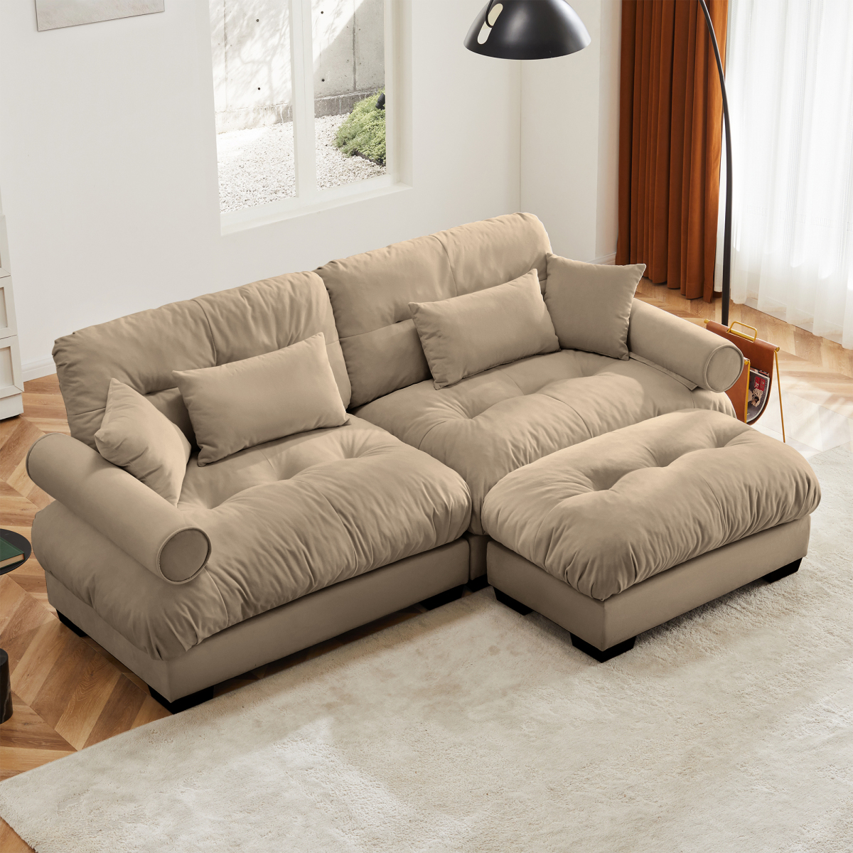 Product Name:Over Size Modern Two-seater Sofa with Ottoman, Velvet 2-Seater with Round Bolster Armrests,With Waist Pillow and Throw Pillows,Small L Shape Sofa For Living Room, Reading Room , Loft and Bedroom,Camel