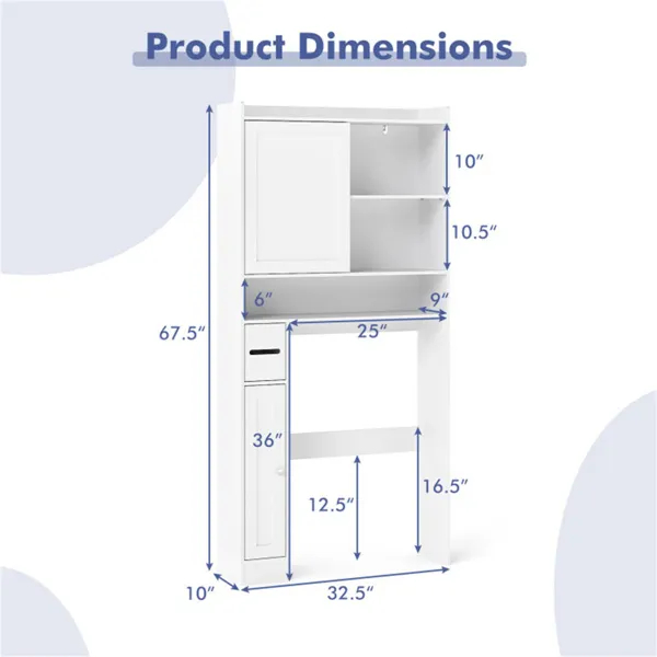 ● Space-saving Toilet Rack: The storage cabinet can be set over the toilet or washing machine, which expands the available storage space without taking up too much floor space. It is an ideal space saver of your bathroom or laundry room. The finished size is 32.5" x 10" x 67.5" (L x W x H).