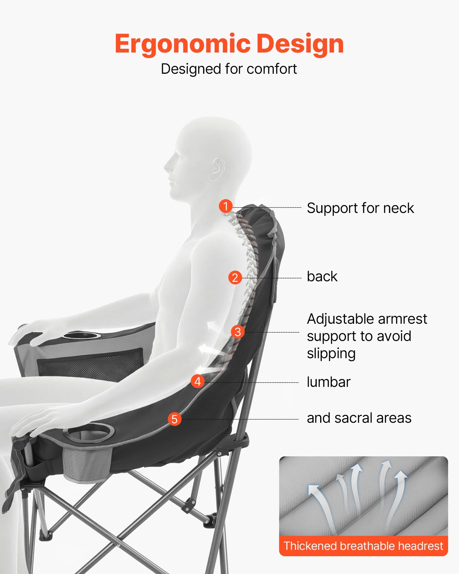 Comfortable Seating: This camping folding chair features a solid cotton padded backrest. The seat measures 21.2 in in back height, 21.2 in in seat depth, and 18.9 in in width. The high-back supports the waist and follows natural body contours
