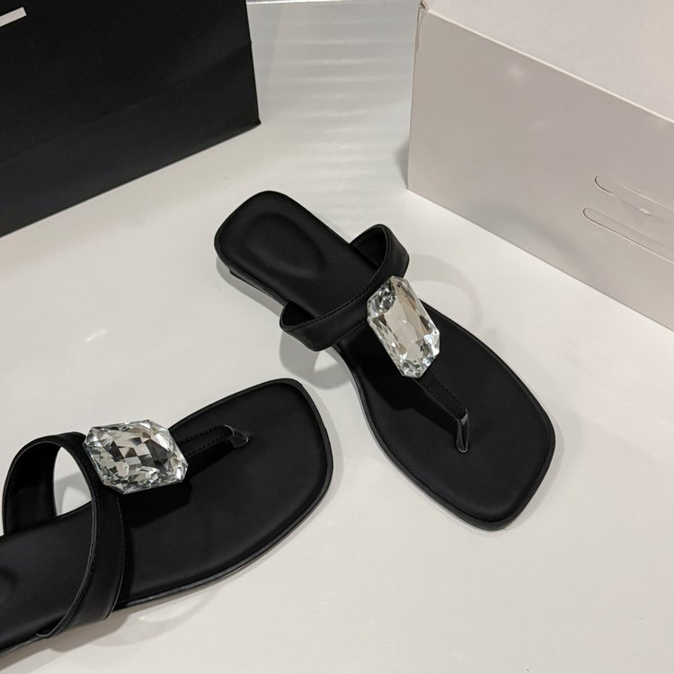 Oversized Crystal, Square Toe, Thong Sandals, French Glam, Low Block Heel, Slides