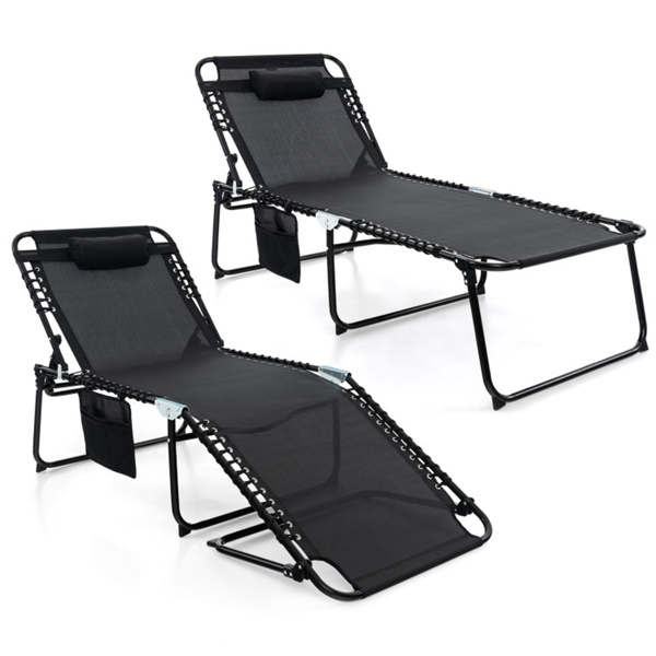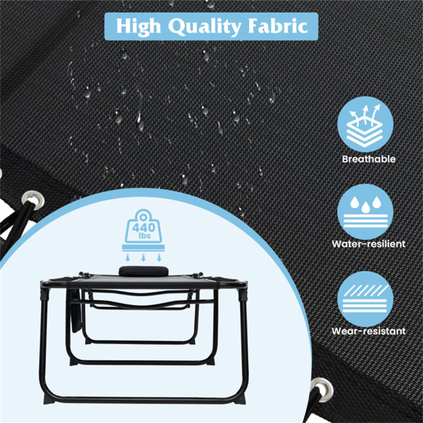 Higher and Wider Design: This patio chaise lounge chair is 27" wide and 16" high, larger than other ones. As such, it provides more space for you to stretch and adapt to people of different body types. Personalized Coziness: Equipped with a 4-position adjustable backrest and a detachable pillow, the reclining lounge chair allows for customizable relaxation. And the footrest adjusts as needed. Moreover, the removable side pocket keeps outdoor essentials within easy reach. Simple to Fold and Carry: The patio sun lounger is designed to be lightweight and foldable, which simplifies transport as well as storage. Whether you are heading to beach excursions, camping trips, and other outdoor adventures, this chair is suitable for multiple purposes. High-Quality Materials: Crafted with breathable fabric on a sturdy U-shaped metal frame, this chair ensures durability and stability. What's more, the reinforced connections and non-slip foot pads increase overall steadiness. The oversize folding chaise lounge supports up to 440 lbs.