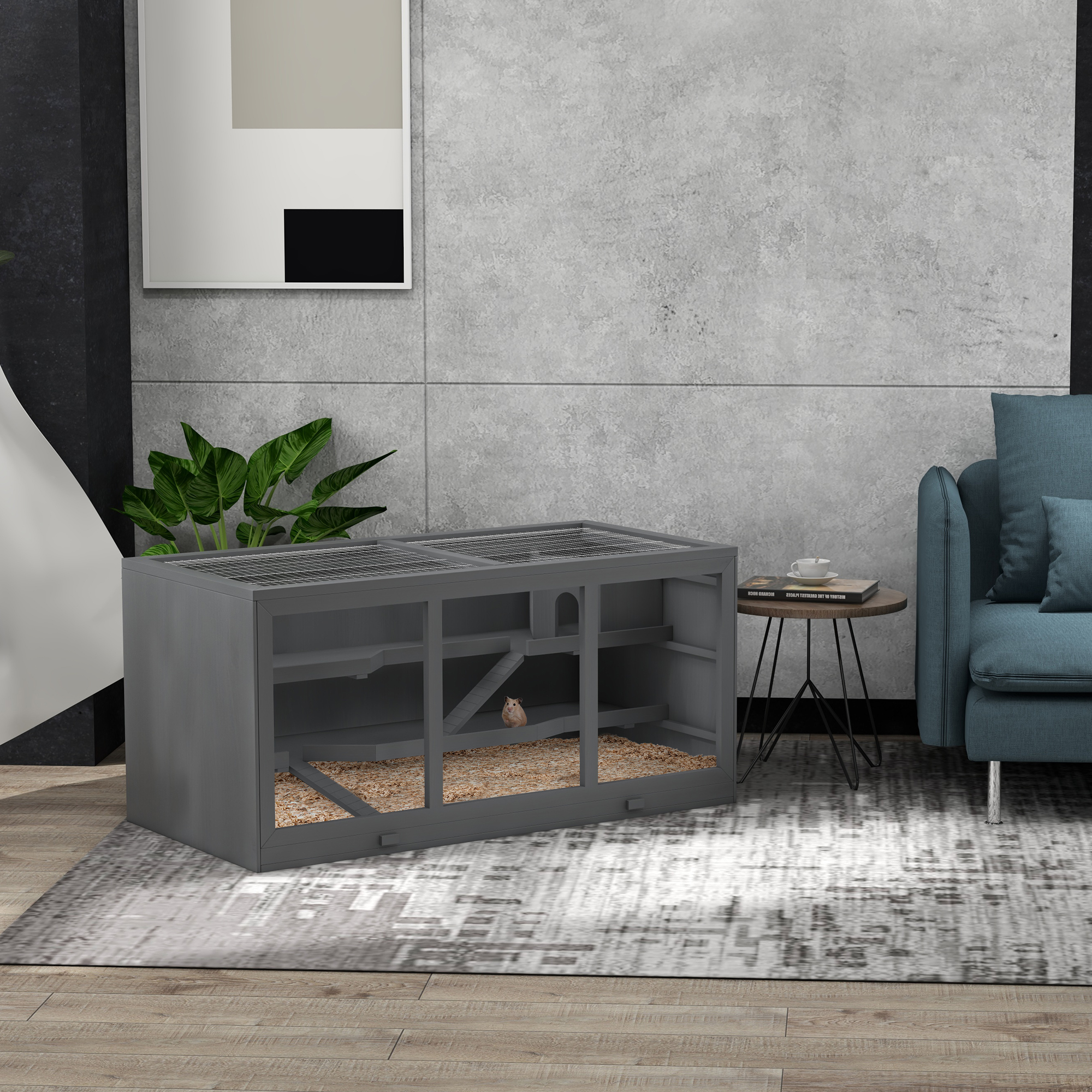 PawHut Oversized Wooden Hamster Cage, Gerbil Cage and Other Small Animal Habitat, Hamster Habitat with Open Roof, Cabin, Ramp, Grey