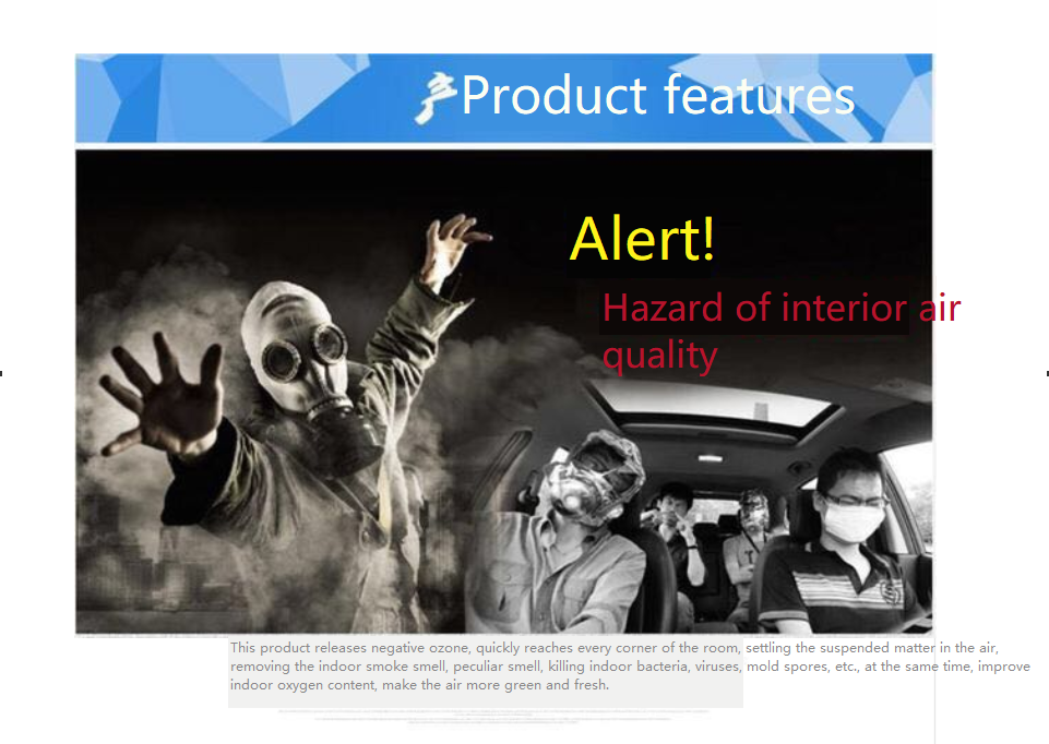 Plugged in can use scope of application: suitable for home, car, workshop, greenhouses, toilet, meeting room, public sterilization, air purification ozone sterilizing machine the goods using the principle of lightning discharge ozone, using air as raw materials, the release of high concentration ozone by abrupt change along the surface discharge technology, and ozone is one of the currently known strong oxidizer, under a certain concentration, can rapidly kill the water and all kinds of harmful bacteria in the air.