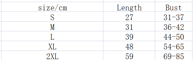 Size: S Bust 31~37 (suitable for 5~8 kg) M Bust 36~42 (suitable for 9~12 kg) L Bust 44~50 (suitable for 13~22 kg) XL Bust 54~65 (suitable for 23~38 kg) 2XL bust 69~85 (suitable for 39~45 kg)