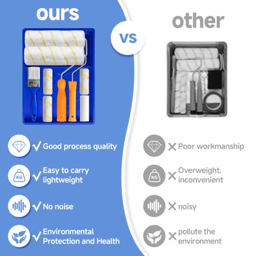 Our professional decorating set includes- 23cm paint roller frame, 23cm paint rollers, 23cm paint tray, 10cm paint roller frame, small rollers for painting, and a 4cm paint brush. Just add paint and you're ready to go!