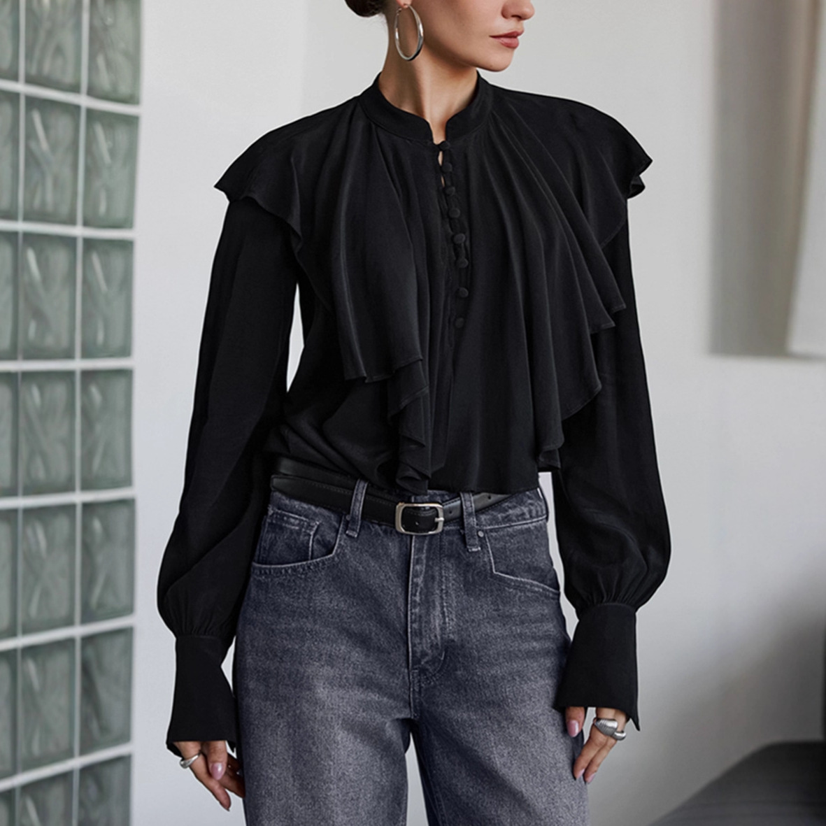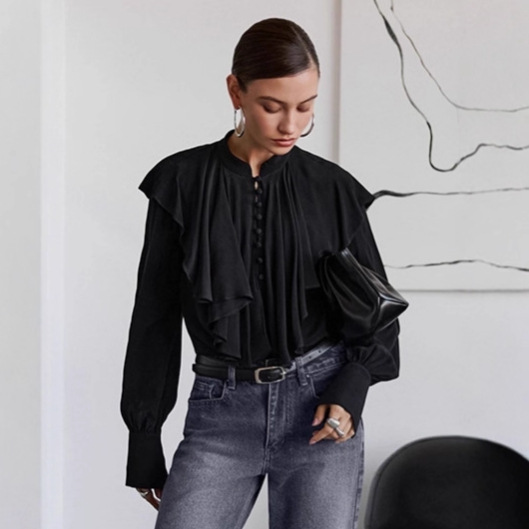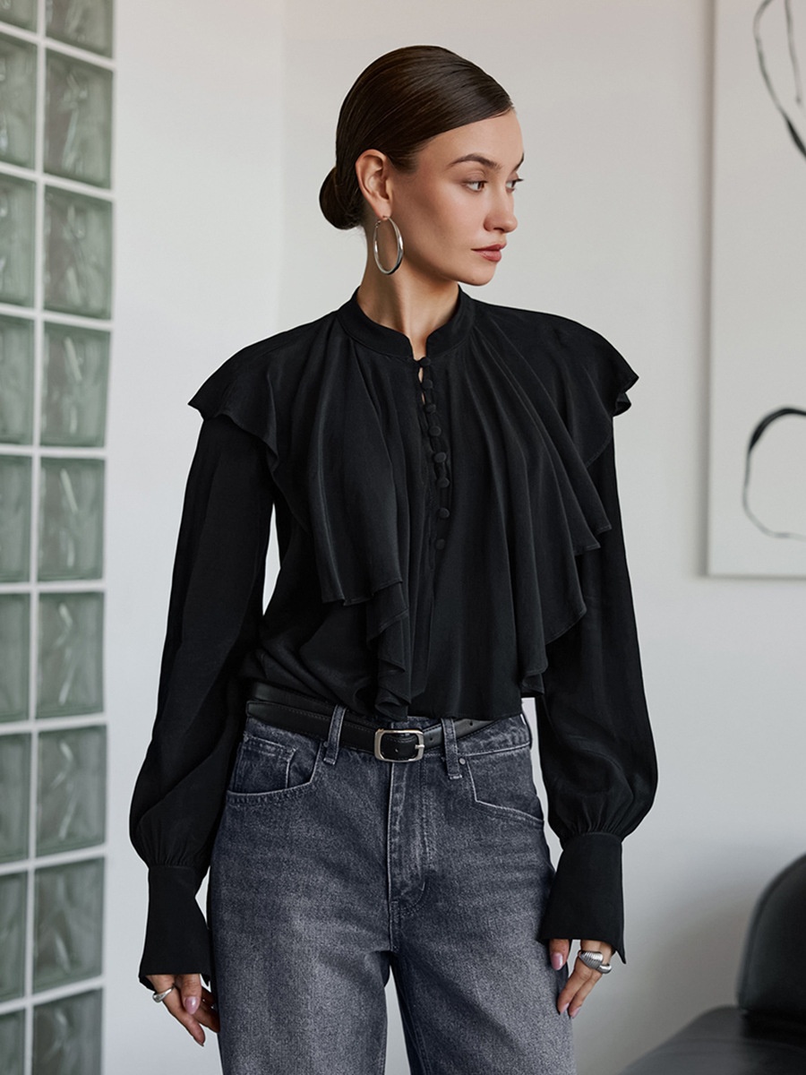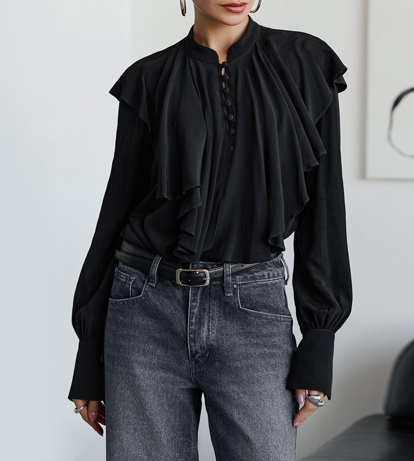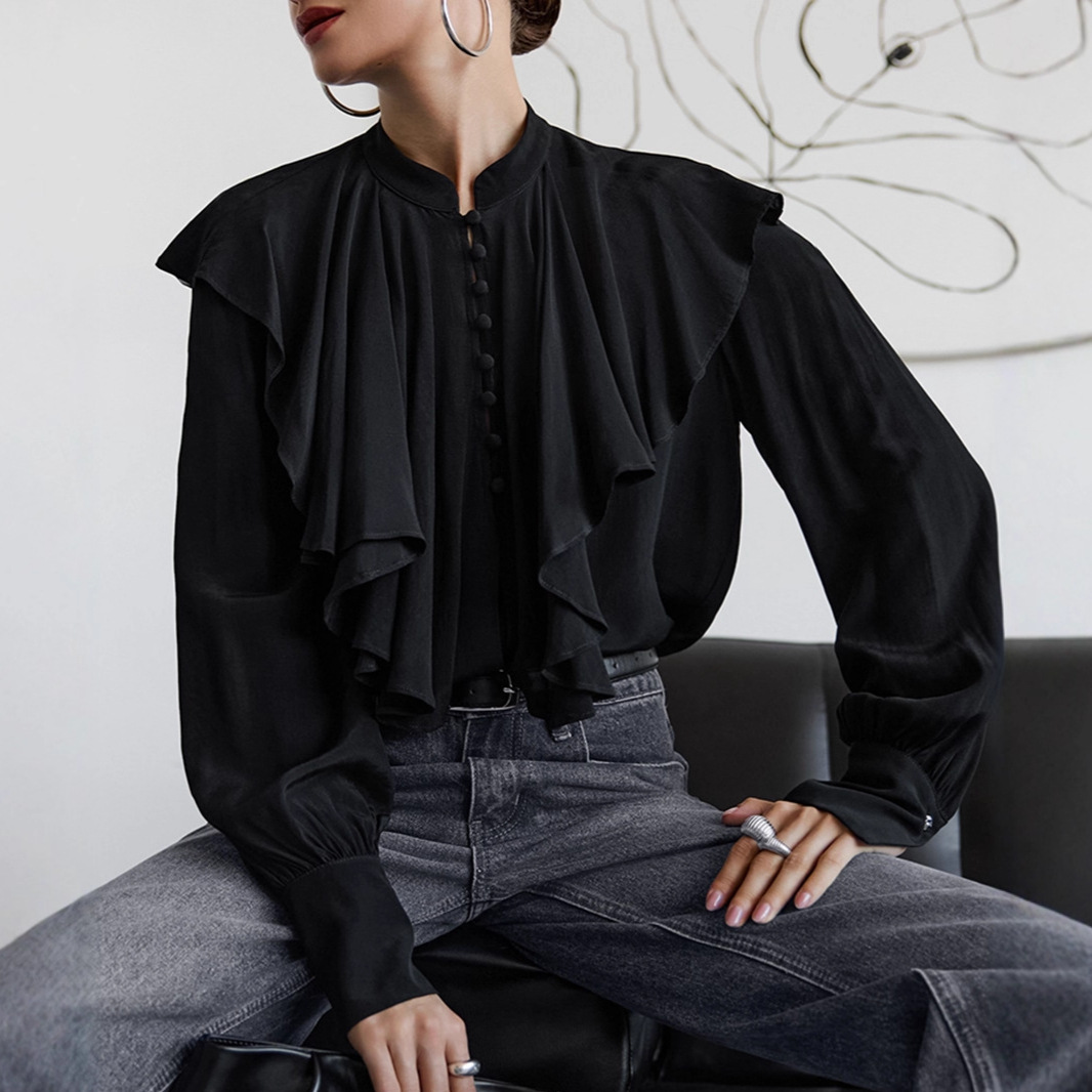 Palace Style Draped Ruffle Top Elegant Loose Black Women's Clothing