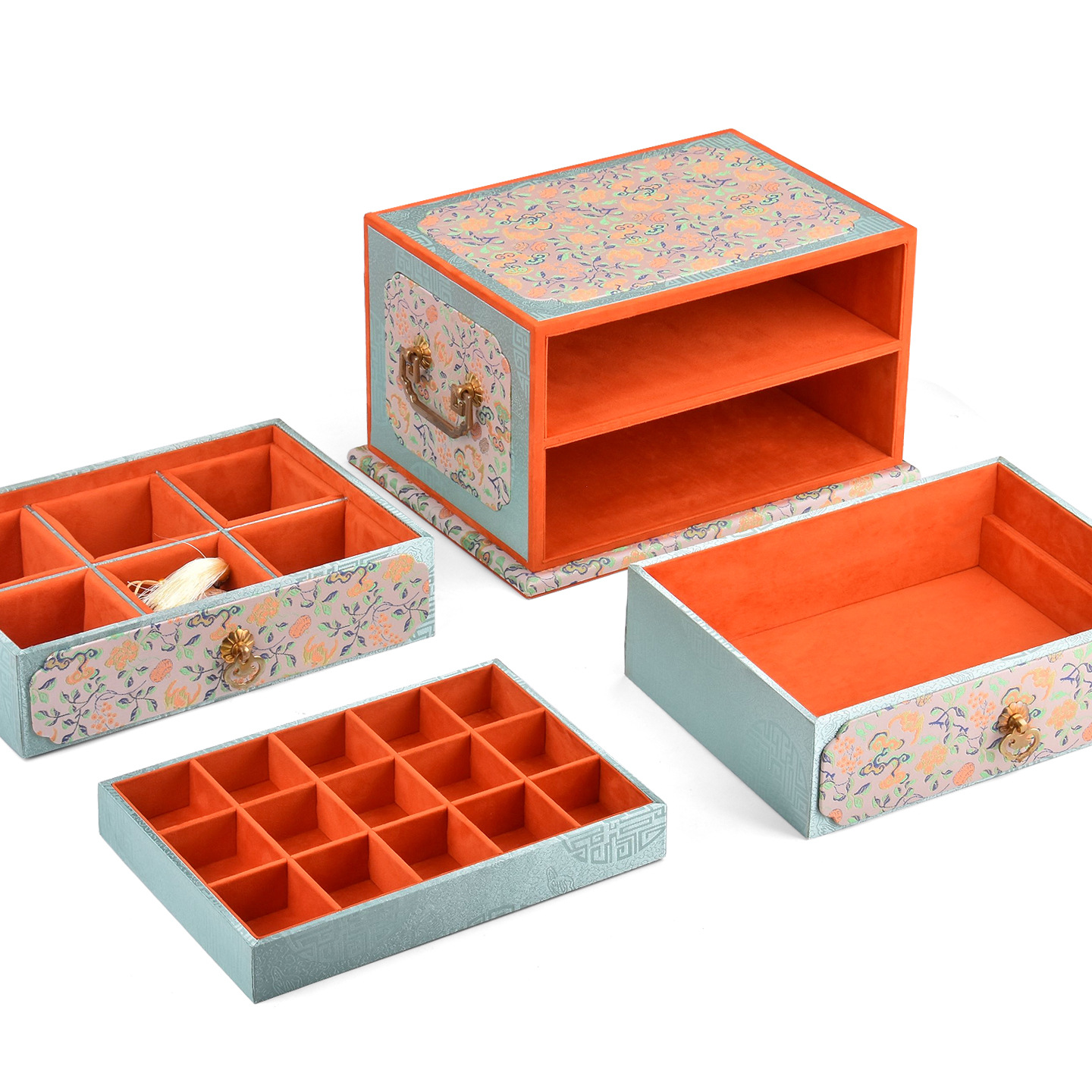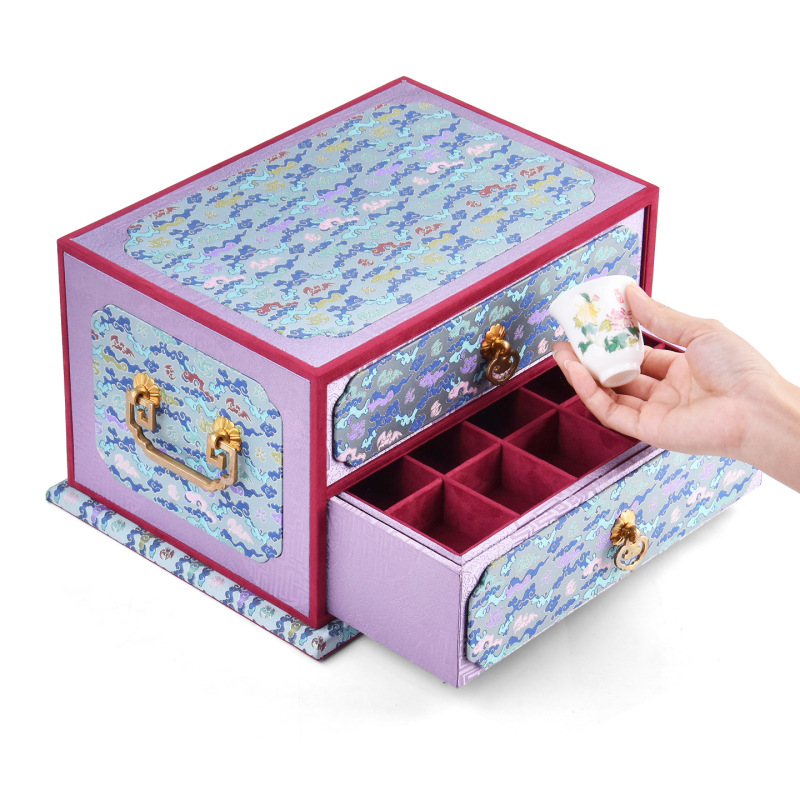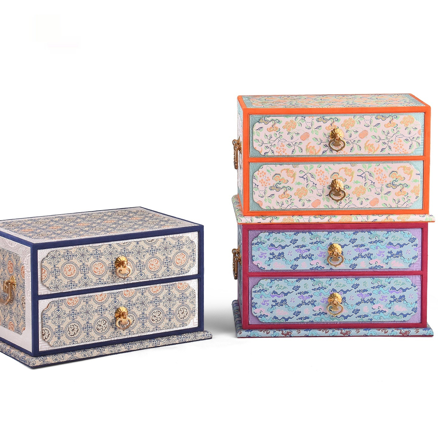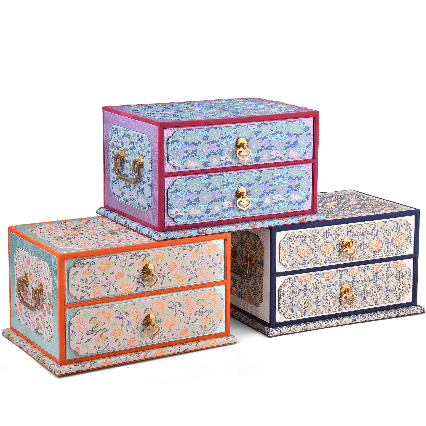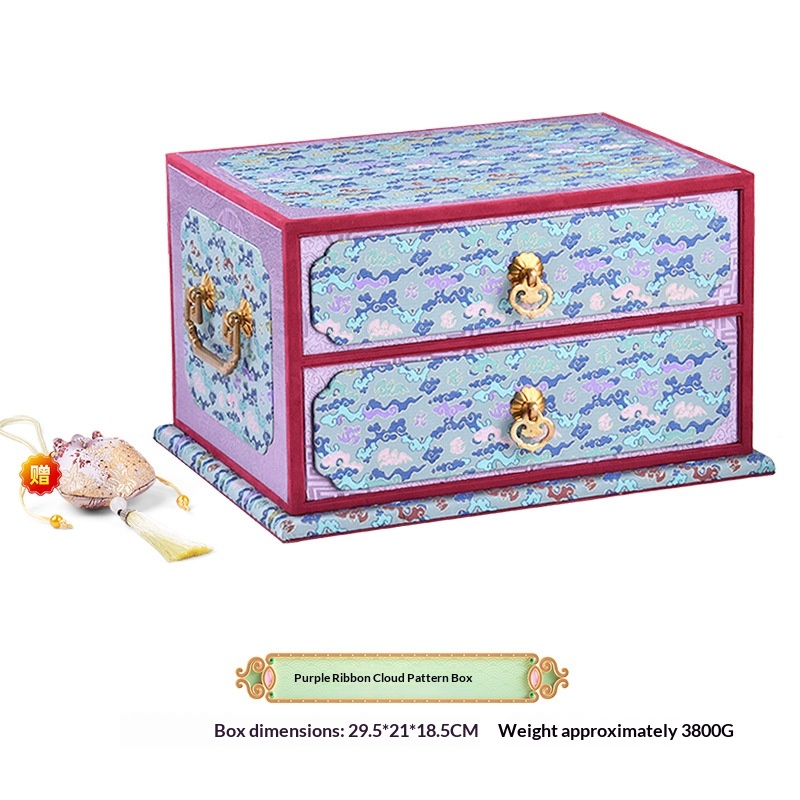 Colors: Double-layer purple—purple ribbon cloud-pattern box; double-layer orange—crimson smoke-and-cloud brocade ground with floral motifs box; double-layer blue—blue mist swirling pattern box