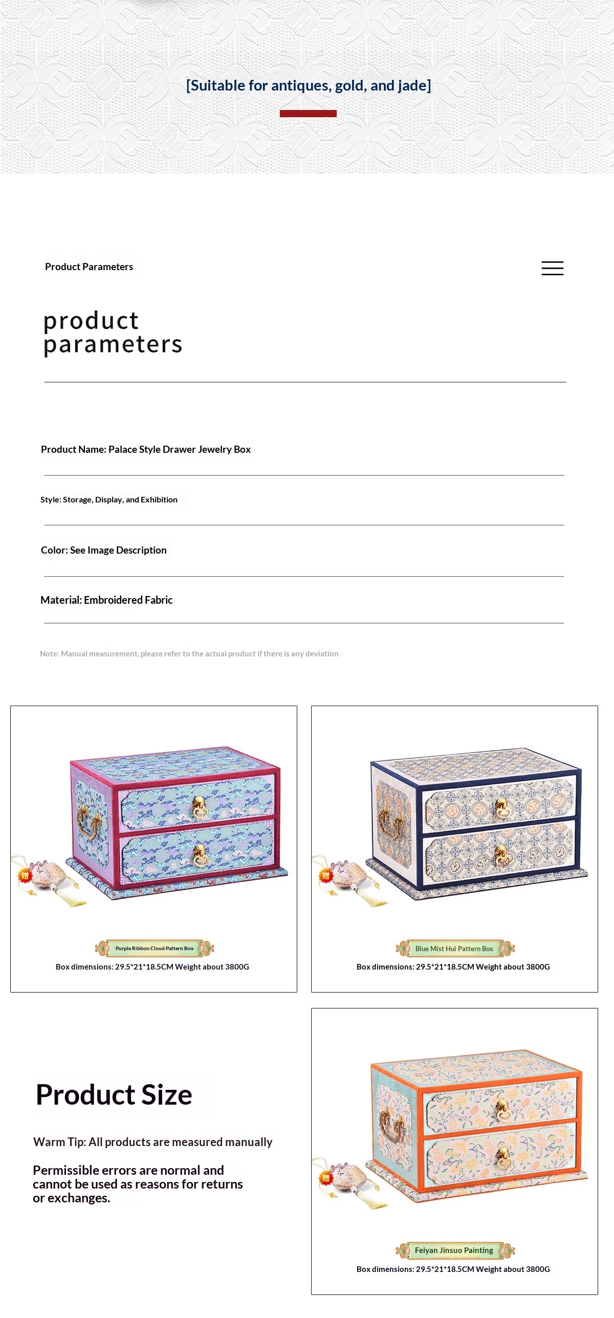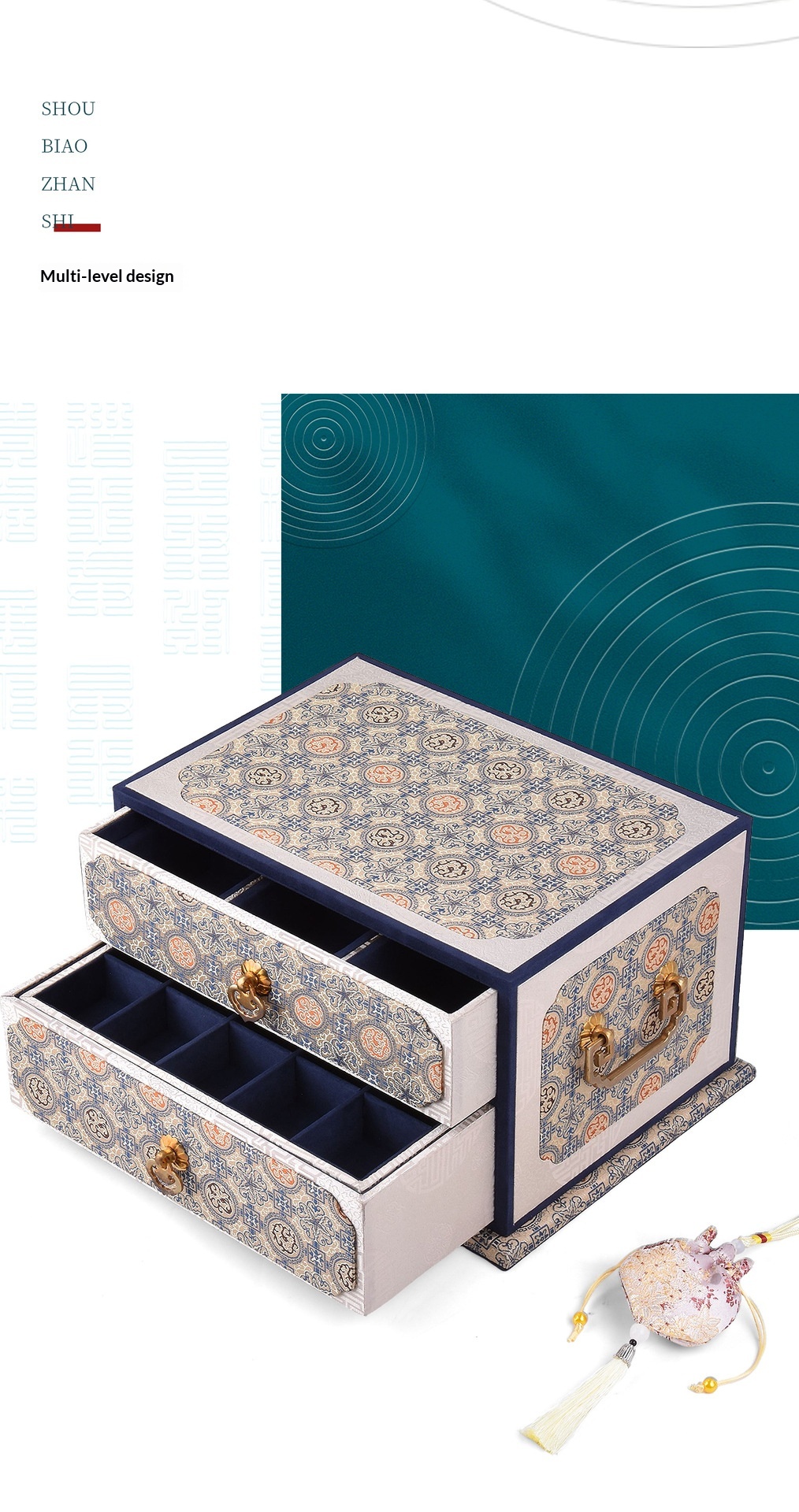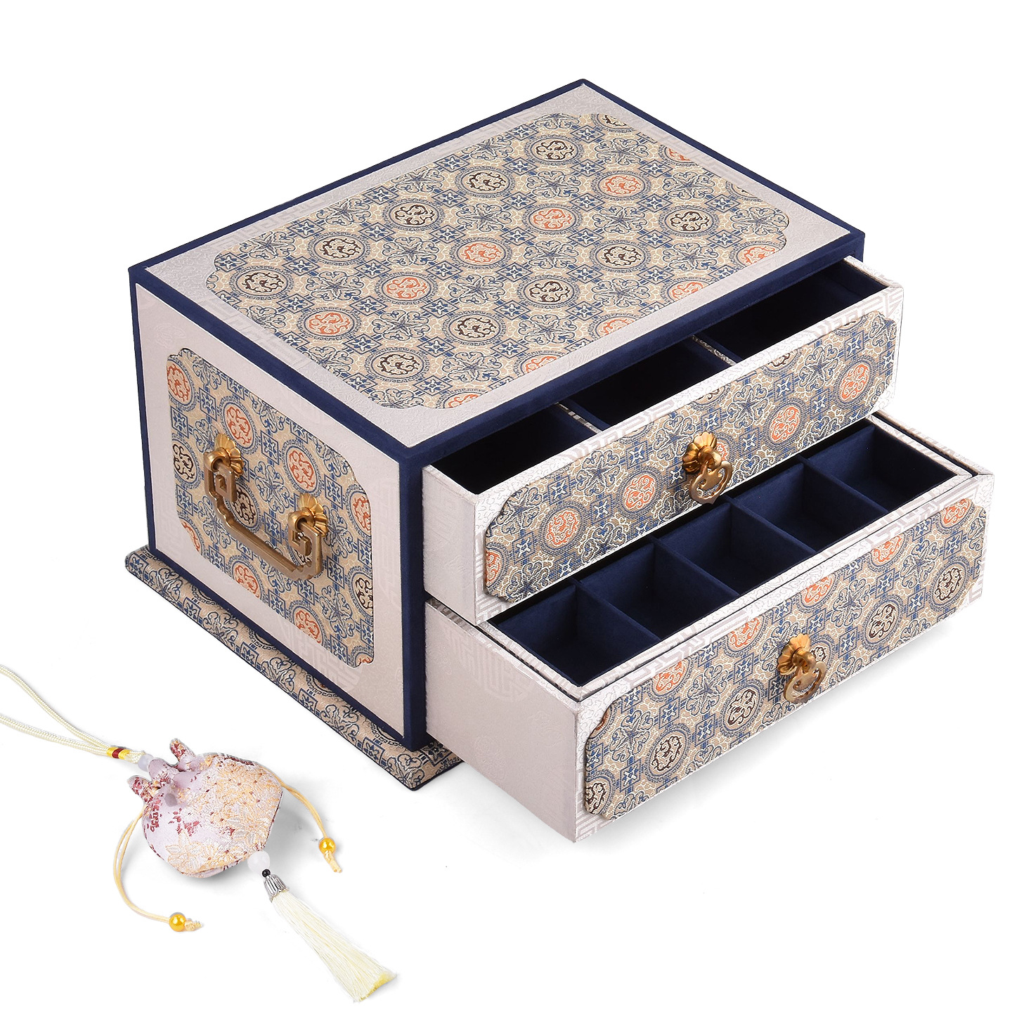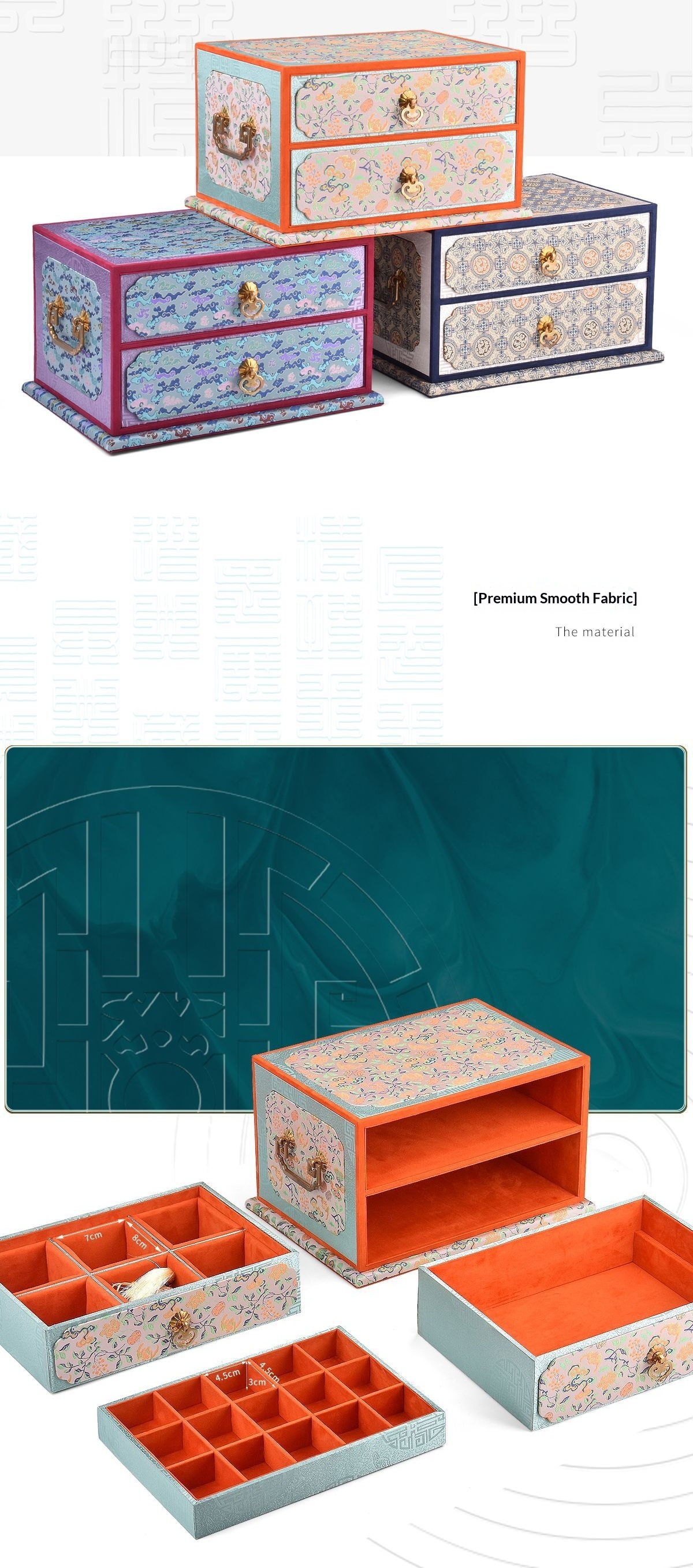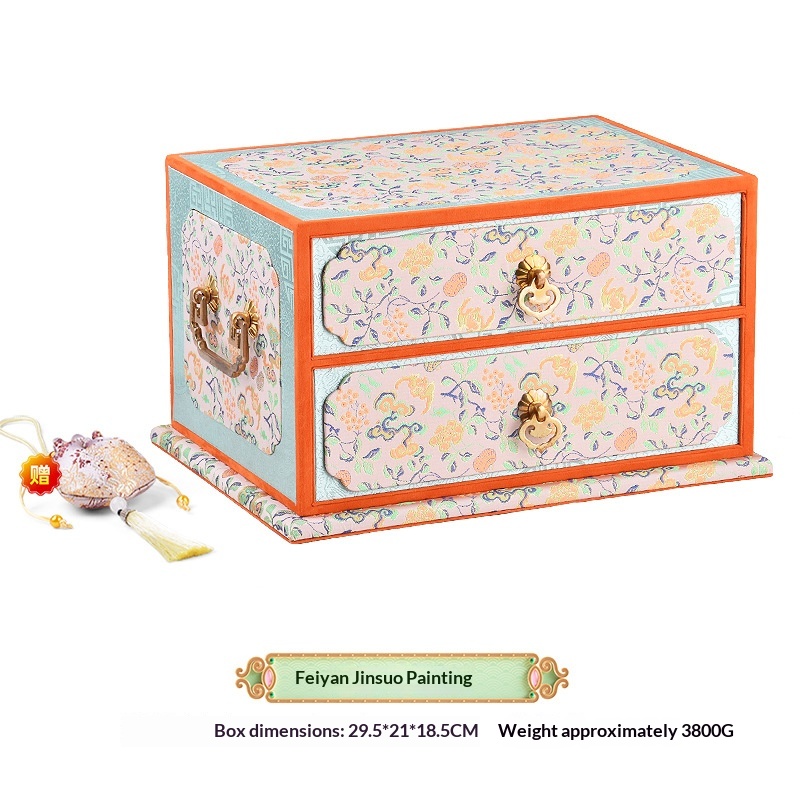 Colors: Double-layer purple—purple ribbon cloud-pattern box; double-layer orange—crimson smoke-and-cloud brocade ground with floral motifs box; double-layer blue—blue mist swirling pattern box