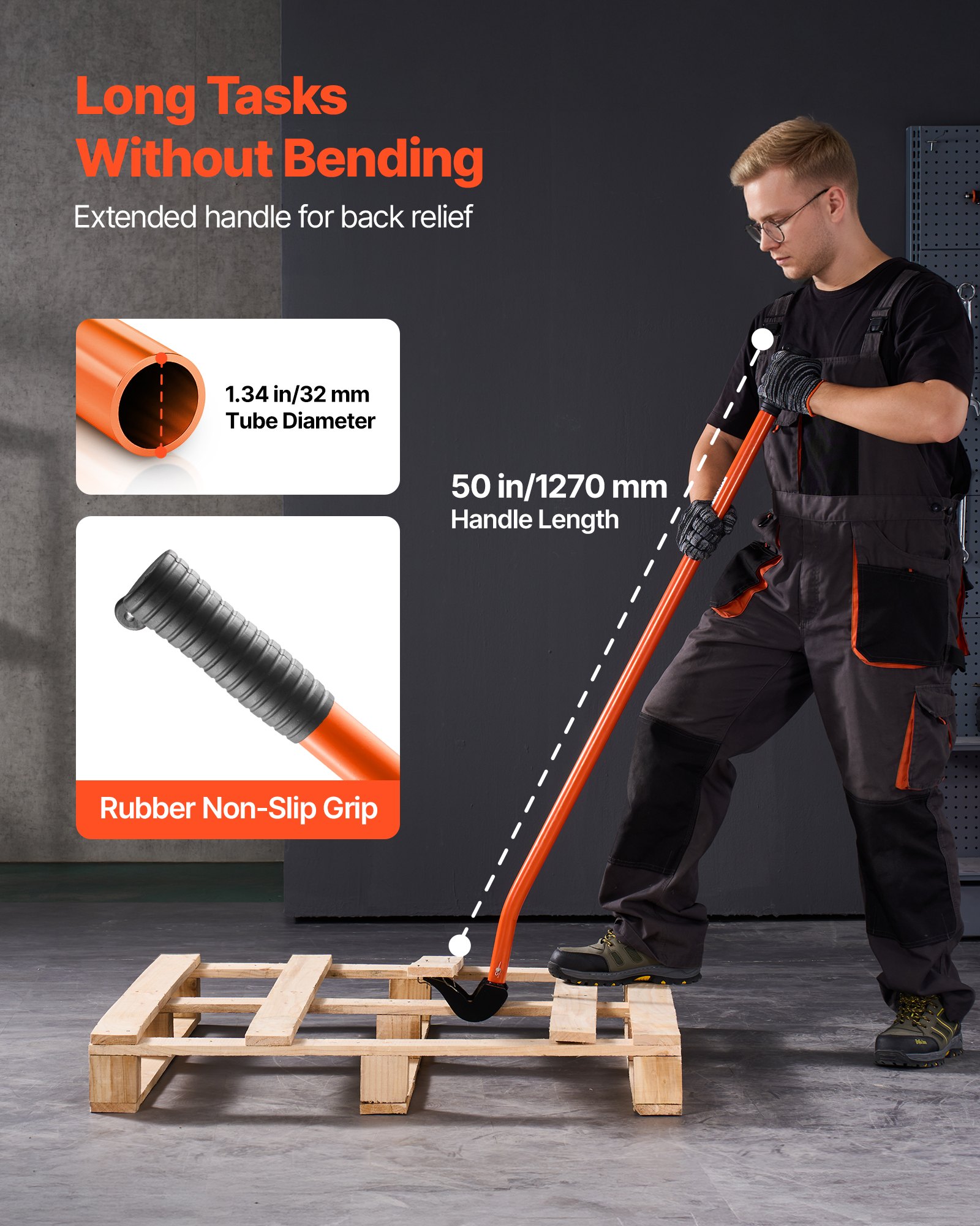 Ergo Leverage: This extended 50 in handle of our pallet wrecker supports an upright stance. You reduce bending, ease back strain, and keep long sessions more comfortable and efficient