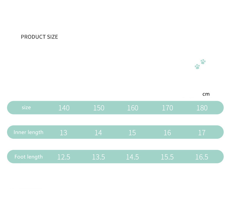 Size: [150] 15CM recommended foot length 14.5CM, [160] 16CM recommended foot length 15.5CM, [170] 17CM recommended foot length 16.5CM, [180] 18CM recommended foot length Length 17.5CM,【190】Shoe length 19CM recommended foot length 18.5CM,【200】Shoe length 20CM recommended foot length 19.5CM