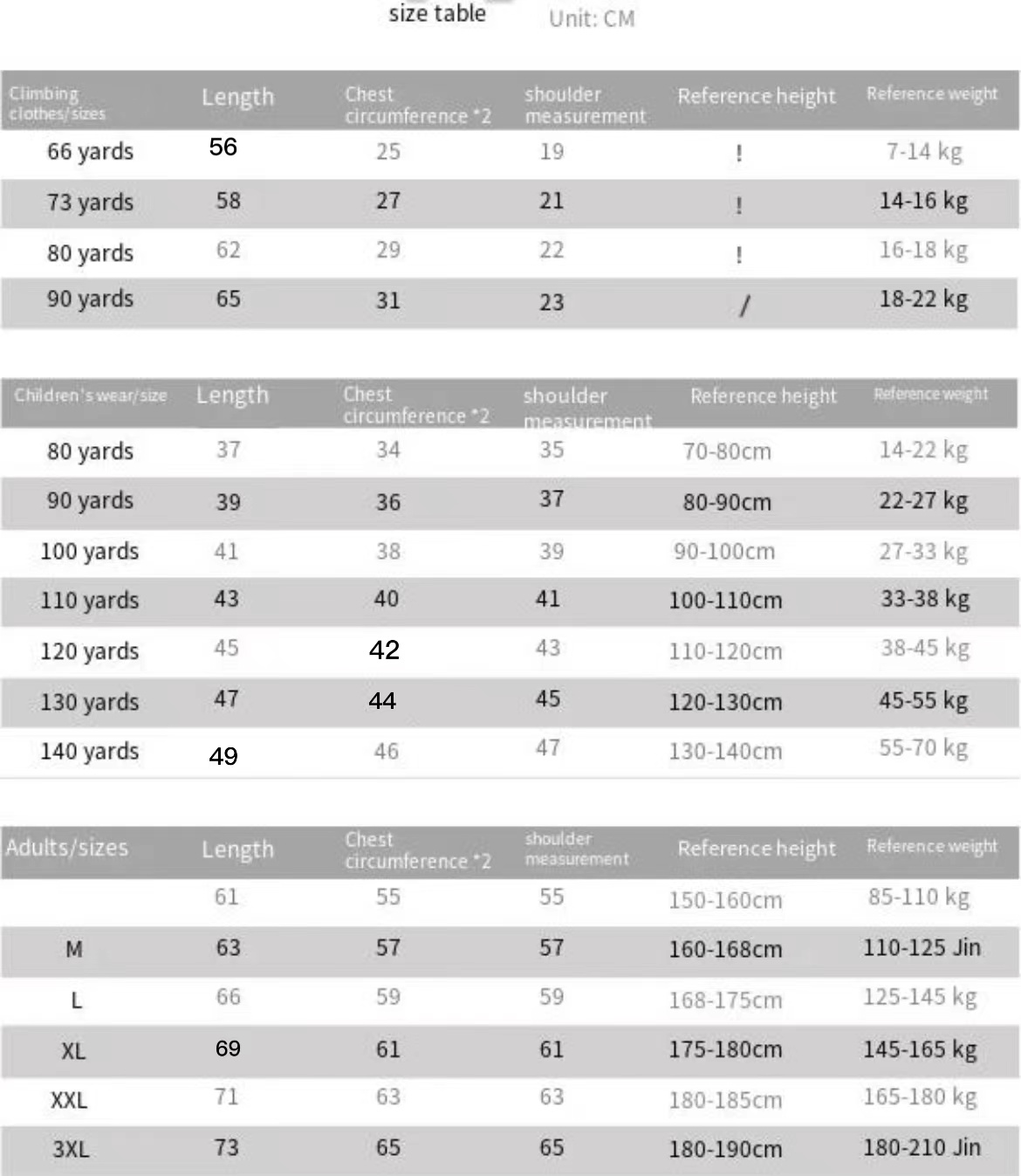 Size: Climbing suit66,Climbing suit73,Climbing suit80,Climbing suit90, 80,90,100,110,120,130,140,150, S,M,L,XL,XXL,3XL