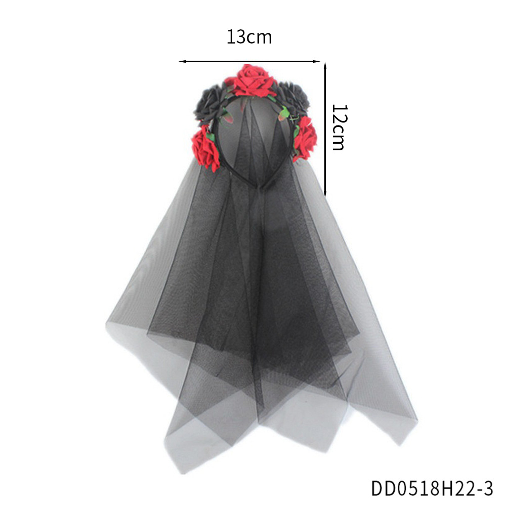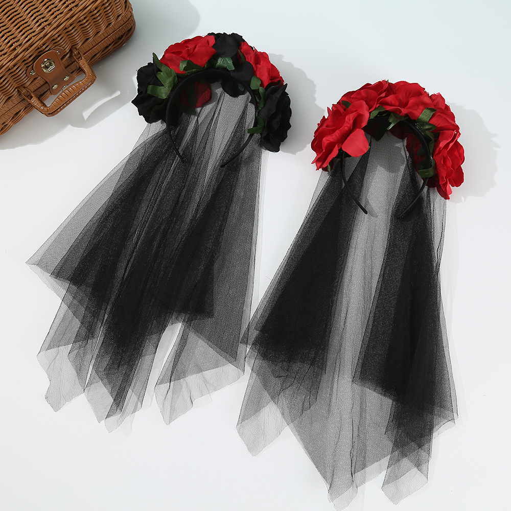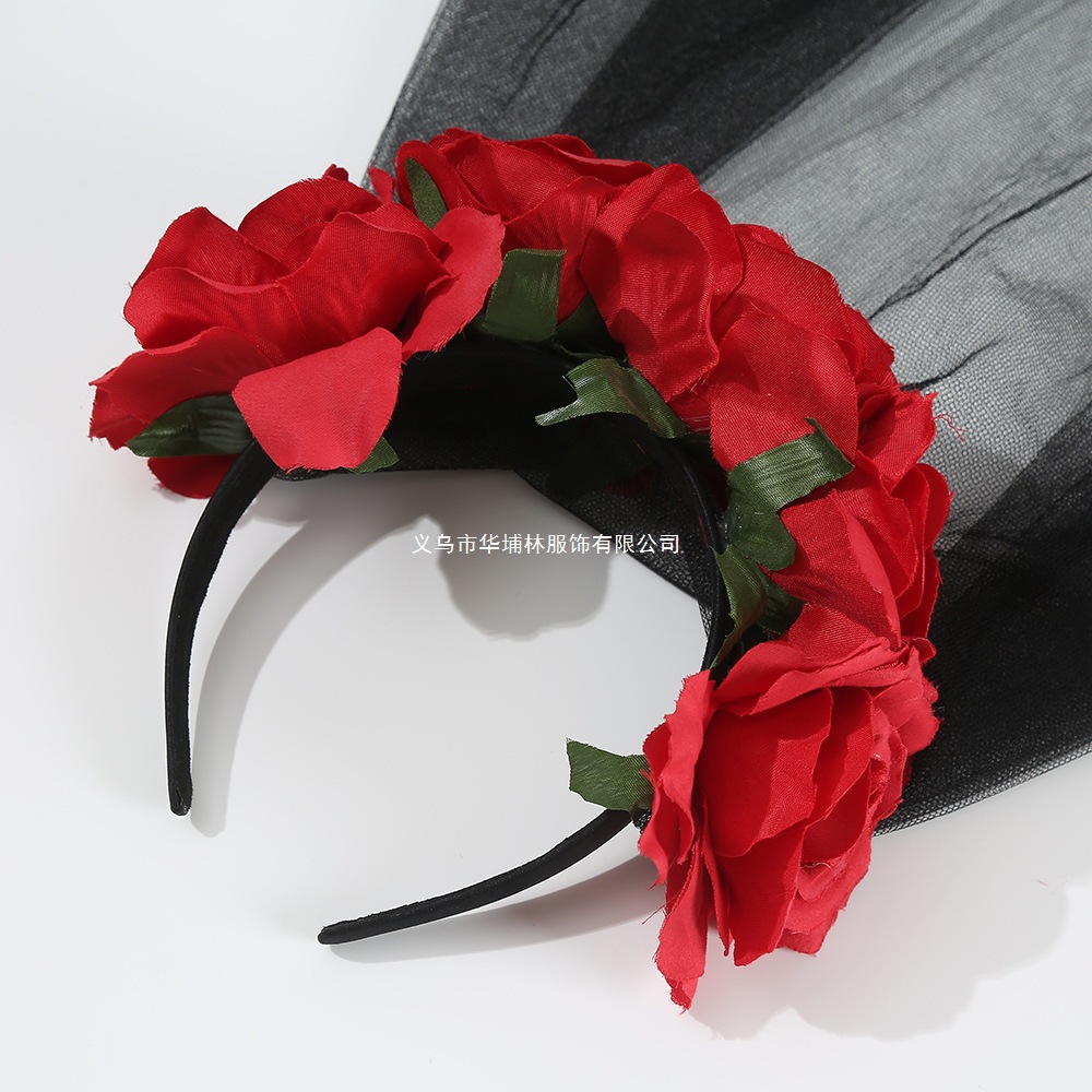 Colors: DD0518H22-1 Red velvet rose hairband, DD0518H22-2 Black velvet rose hairband, DD0518H22-3 Red-and-black striped velvet rose hairband; 0T0A2733 Black skull-patterned tights; 17HH0057A Artificial beard; DD0315A23-1 French fry–shaped hat, DD0315A23-2 Taco–shaped hat, DD0315A23-3 Fun pizza–shaped hat