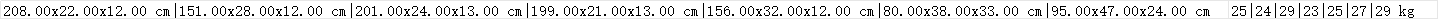| 208.00x22.00x12.00 cm|151.00x28.00x12.00 cm|201.00x24.00x13.00 cm|199.00x21.00x13.00 cm|156.00x32.00x12.00 cm|80.00x38.00x33.00 cm|95.00x47.00x24.00 cm | 25|24|29|23|25|27|29 kg |