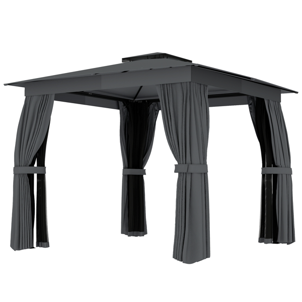 Features: - Double-tier UPF30+ polyester roof with netting for ventilation and protection from unwanted guests - Roof drainage holes prevent water pooling - Include curtains for private settings and mesh net for ventilation and keeping unwanted guests outside - Powder-coated steel columns provides stability and weather resistance - Expansion screws and ground stakes for a firm installation - Ceiling hook allows for easy decoration and accessory hanging - Assembly required Specification: - Color: Black, Dark Gray - Material: Steel, Polyester - Overall Dimension: 118.1" L x 118.1" W x 107.1" H - Column Dimension: 2.36"L x 2.36"W - Column Spacing: 99.6" L x 99.6" W - Single Curtain Dimension: 106.3" W x 74.4" H - Single Net Dimension: 106.3" W x 74.4" H - Eave Height: 74.8" - Beam Height: 75.6" - Windproof Level: 4 (with Expansion Screws) - NOTE: Please clear snow from the roof promptly to prevent excessive weight. Package Includes: - 1 x Gazebo - 8 x Expansion Screw - 8 x Ground Stake - 1 x Manual