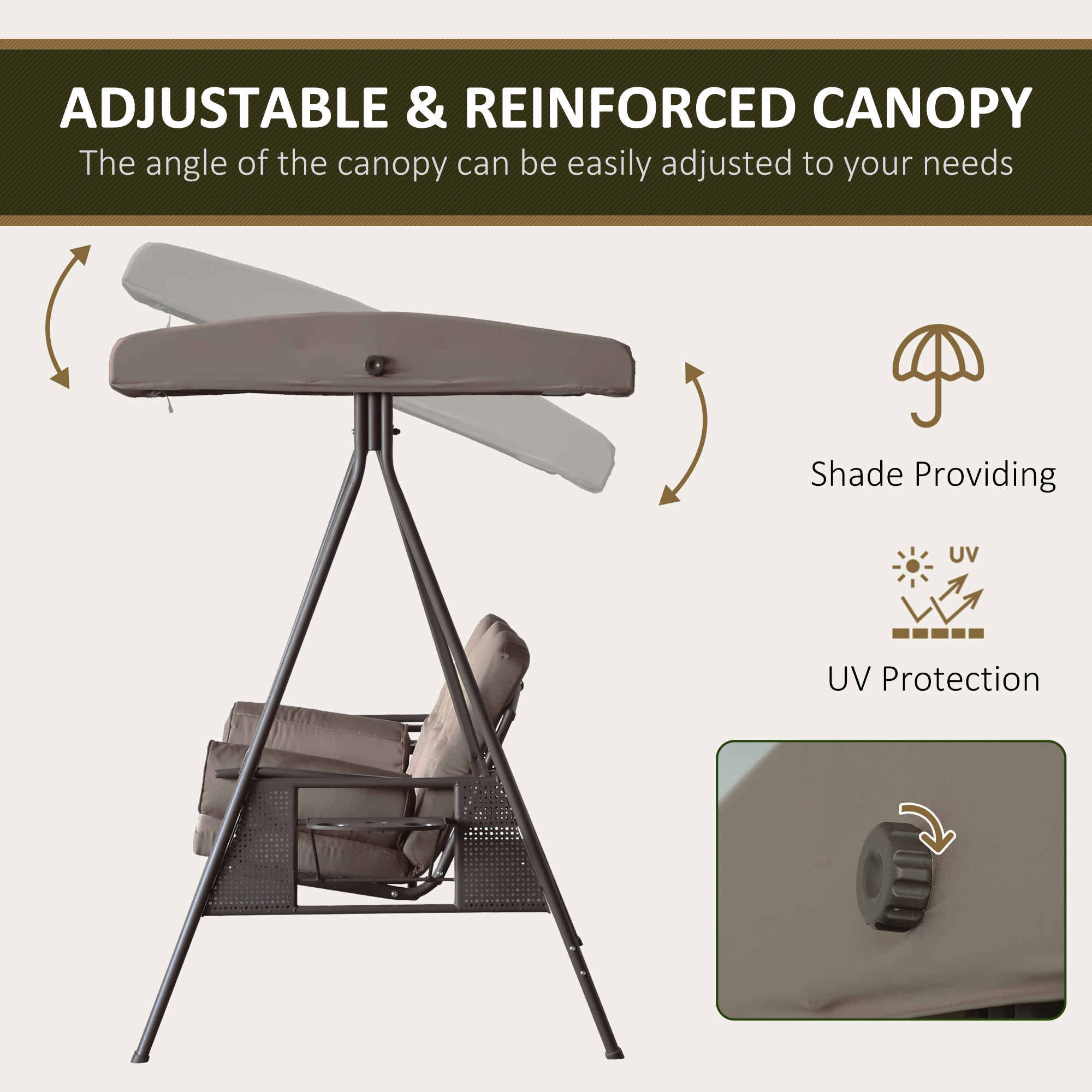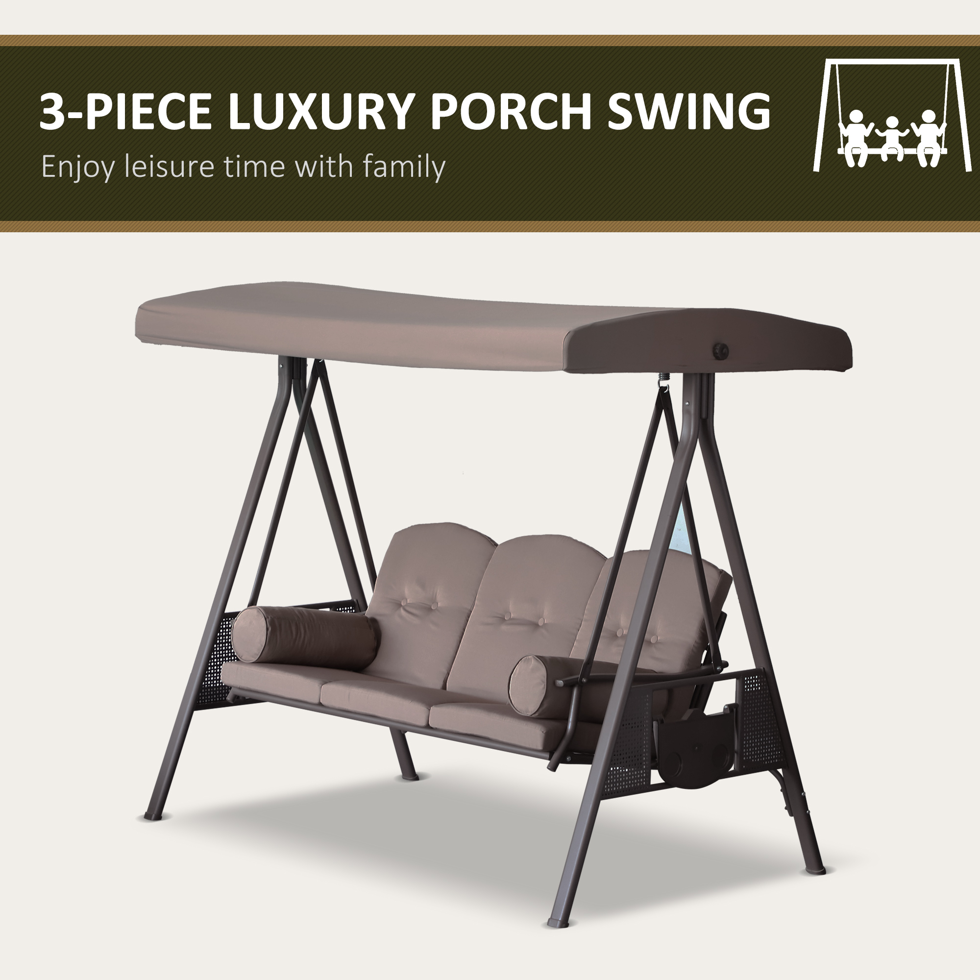 Patio Swing Bench 3-Person Steel Canopy Cushioned With Side Trays Comfortable Brown