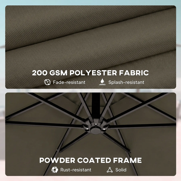 Features: - 6-position 360° rotation and flexible tilted canopy provide customizable shade - 200 gsm polyester canopy resists UV rays (UPF 30+) and fading - Powder coated pole and 8 steel ribs can well resist rust - Crank handle ensures effortless opening and closing - Vented canopy enhances wind stability - Includes a protective cover for added stability and longevity - Cross base included requires 60 kg weights (not included), assembly required Specification: - Color: Tan - Material: Steel, Polyester - Overall Dimension: 118.1" L x 118.1" W x 92.5" H - Canopy Dimension: 116.9" L x 116.9" W - Closed Dimension: 15.7" L x 7.9" W x 102.4" H - Pole Size: 1.89" Dia. - Cross Base Dimension: 31.5" L x 31.5" W - Cover Dimension: 18.9" L x 13.4" W x 82.7" H - Required Base Weight: 132 lbs. (not included) - NOTE: Do not use umbrella during extreme weather (strong wind, heavy rain, snow). Package Includes: - 1 x Cantilever Parasol - 1 x Cover - 1 x Manual