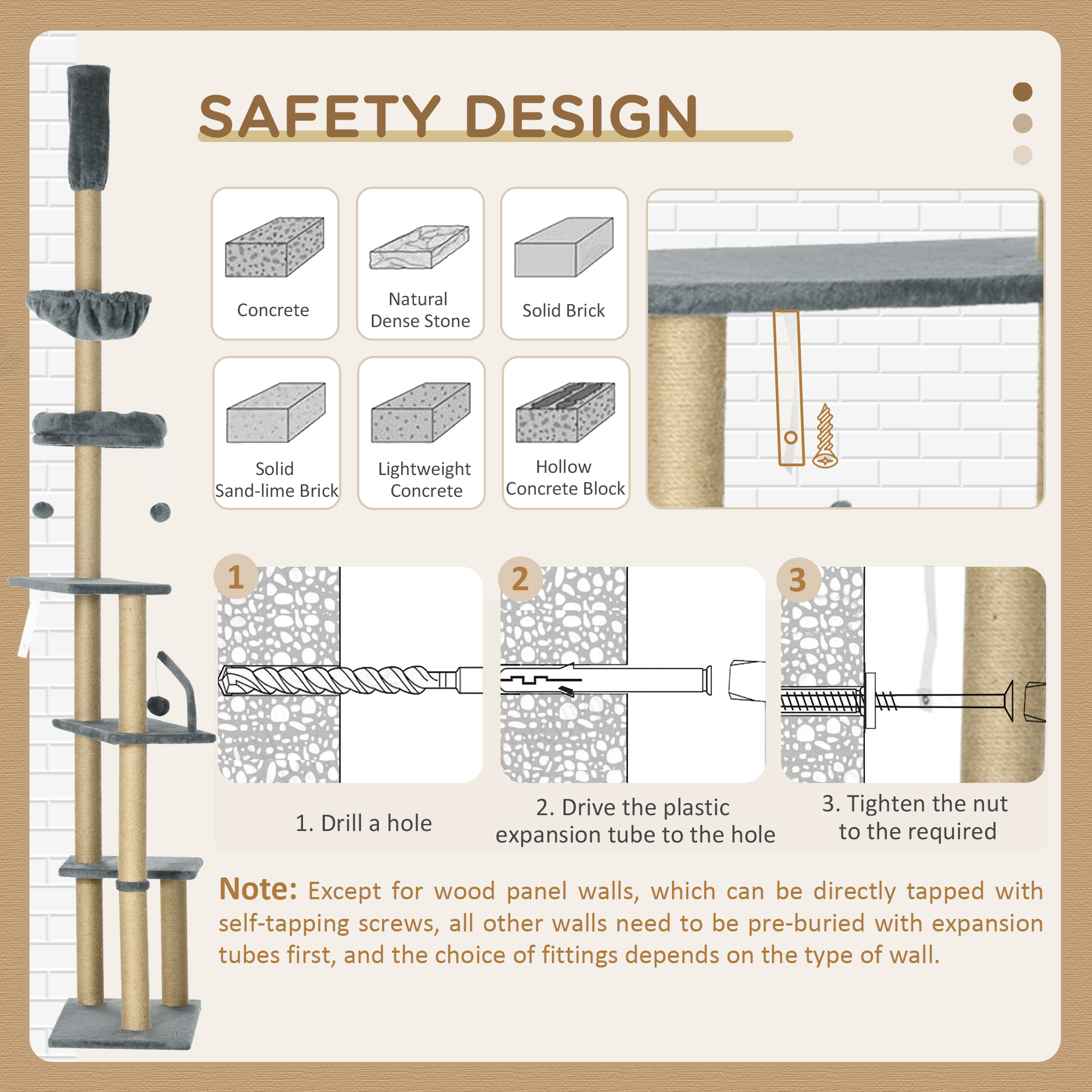 Cats love to play, scratch, climb and nap. Now, they can do it all, thanks to this PawHut floor-to-ceiling cat tree. Multiple levels for them to get up and down, whilst the sisal post lets them dig and sharpen their claws, stopping them from destroying sofas and curtains. When tired, they can lay on the perches, curl up on the bed and relax on the hammock. Finished with soft plush fabric, which covers the entire cat tree, making sure pets are comfortable at all times.