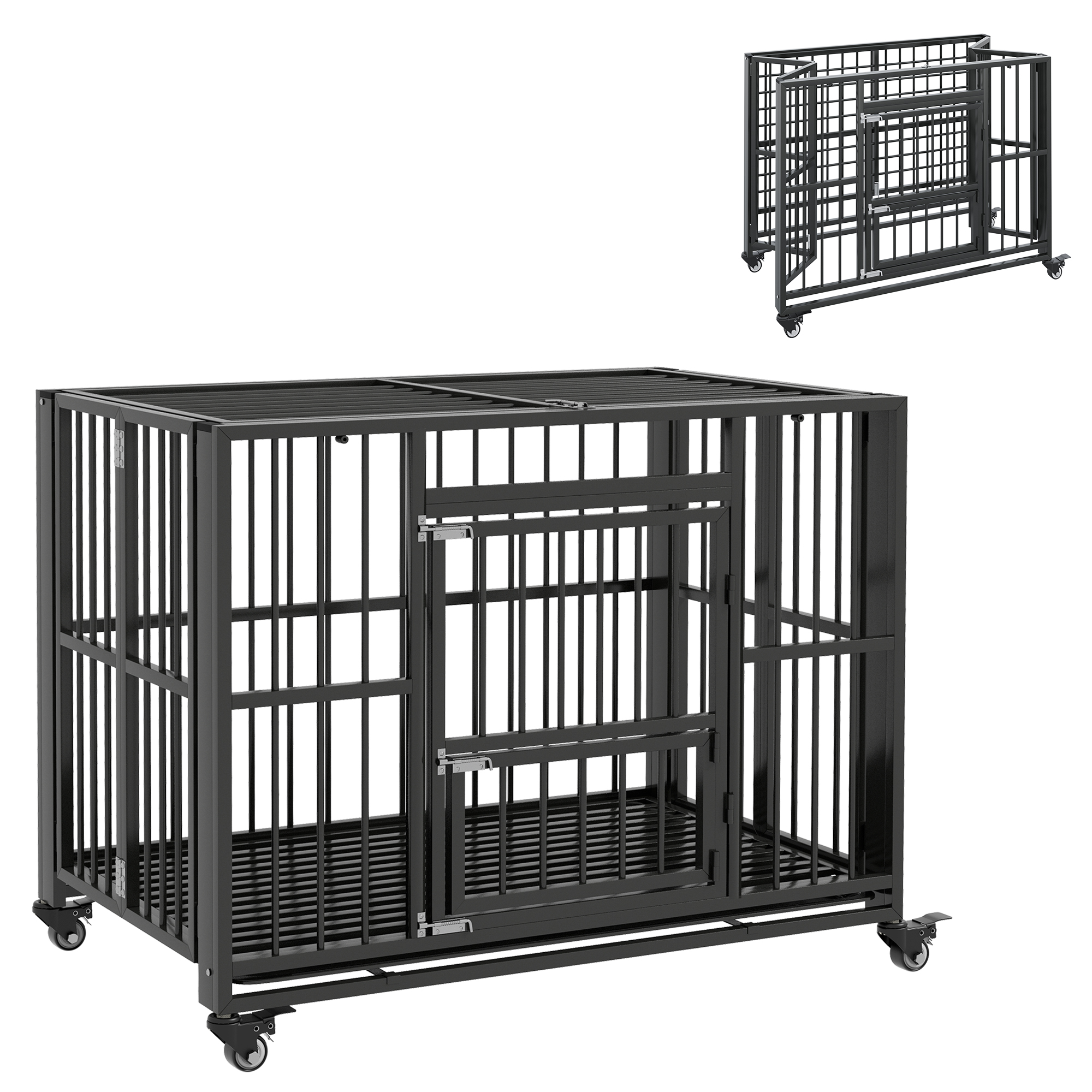 Keep pets in a place with this spacious PawHut dog cage. Its large door with a small door for feeding ensures easy access, whilst the openable top simplifies pet interaction, making feeding and playtime a joy. Universal wheels provide seamless mobility, whilst the removable pan guarantees fuss-free cleaning, keeping their living area fresh. It's a space-saving marvel that folds effortlessly, making storage a breeze. Upgrade their comfort in style, with easy storage and maintenance.