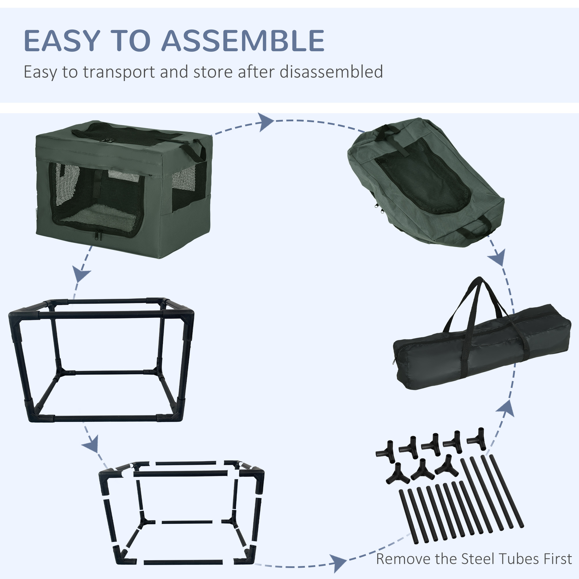 Struggle to travel with pets? With this PawHut fabric dog crate, you'll struggle no more. It has two handles on top, so it's much easier to carry it. Three doors for easy access – they'll enter a spacious area, relaxing on a soft cushion whilst the air flows through the mesh window to keep them cool. It's simple to store with the removable tube frame and comes with a bag, saving space. It can also be used at home, so pets have a cosy lounge.