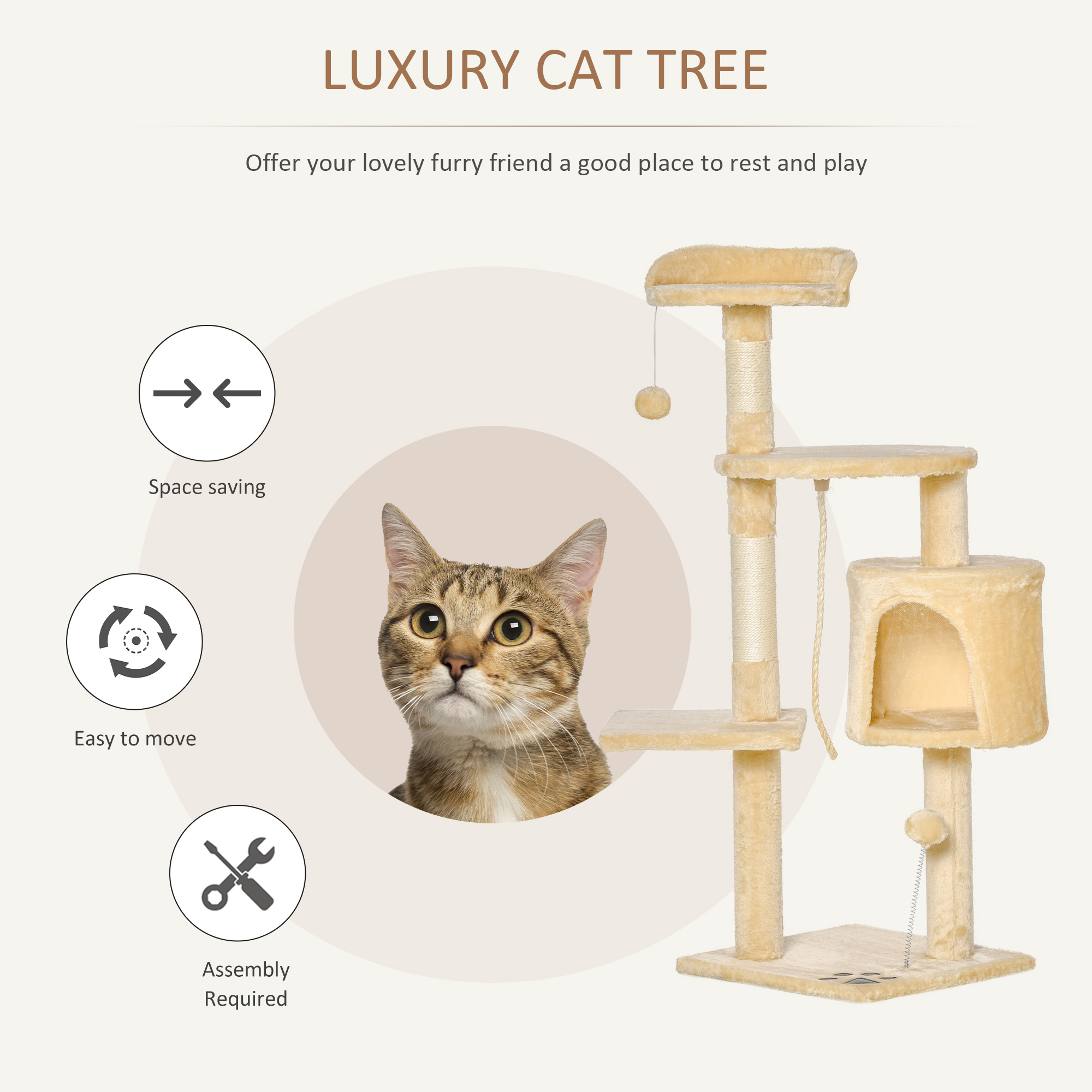Stimulate your cat's natural instincts in a fun and safe way with a 114 cm cat tower from PawHut. It's a multi-use activity center with scratching post, cat house, multiple perches, dangling toy, and spring-loaded pom for extra enjoyment. Cat scratching posts benefit both pets and owners by providing an acceptable release for an animal's natural instincts while saving carpets and household furniture from damage. They provide a comfortable haven for security and rest.