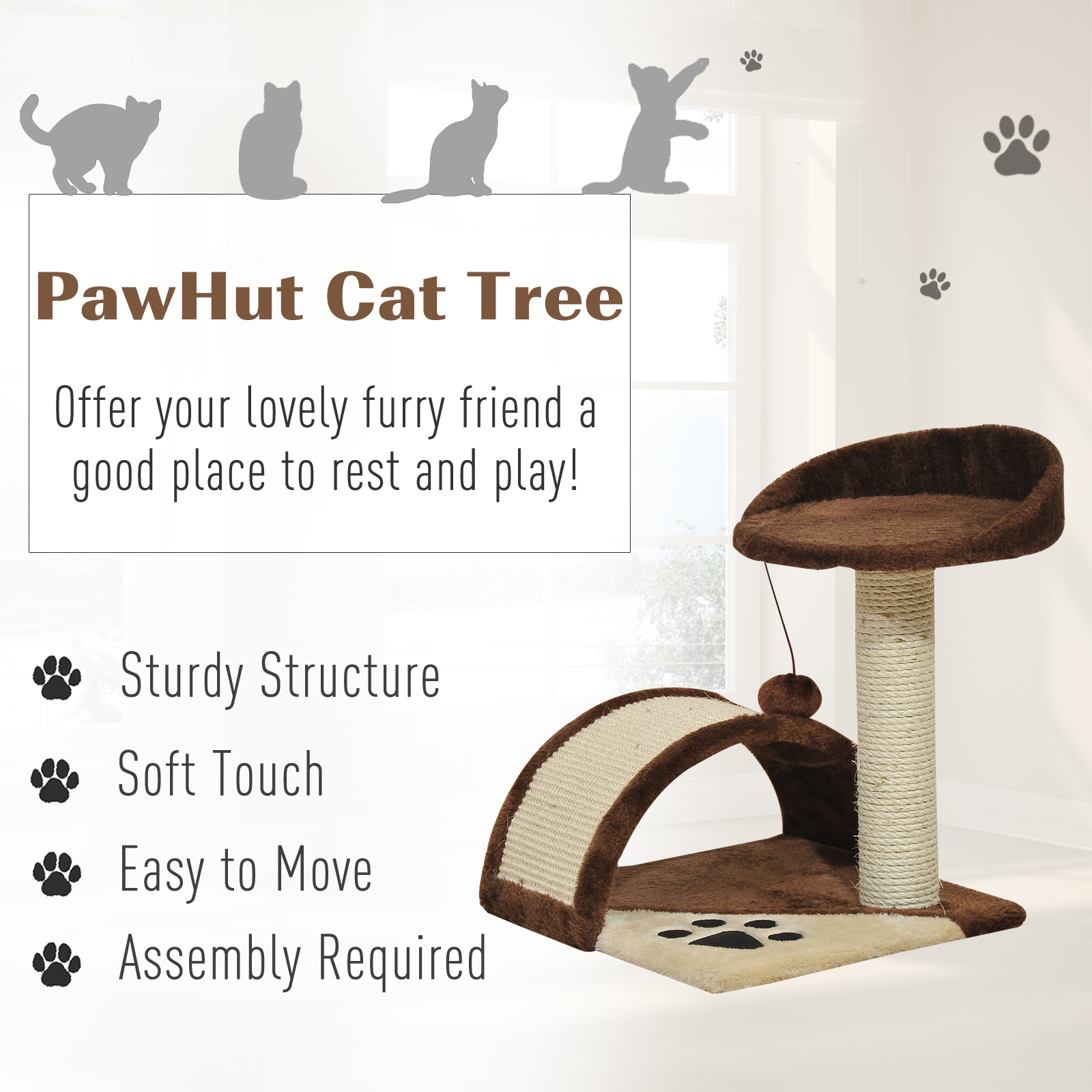 Treat your cat to the ultimate pet haven; a comfortable PawHut cat tree tower, filled with comfort and entertainment. They have a hanging toy ball to swipe at, keeping them busy when feeling playful, whilst the scratching posts and curved scratching board keep their claws sharp and healthy. When it's time to nap, they'll curl up on the top perch, which is covered in soft plush for extra snugness. Watch your pets purr with satisfaction - a piece to make every day extra special.