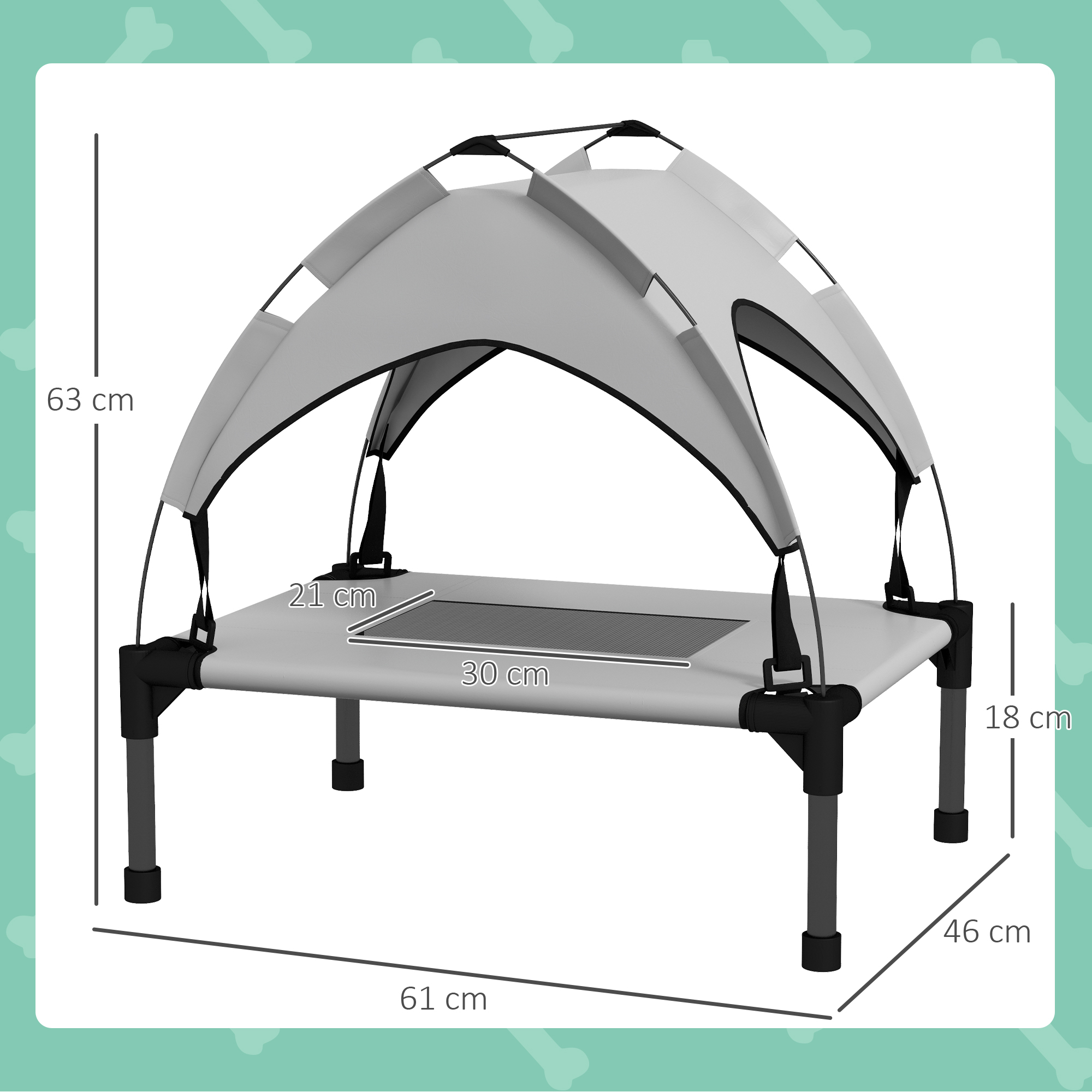 • Overall dimensions: 63H x 61L x 46Wcm. Bed: 61L x 46Wcm. Breathable mesh: 30L x 21Wcm. Storage: 78L x 15Wcm. Off the ground: 18cm