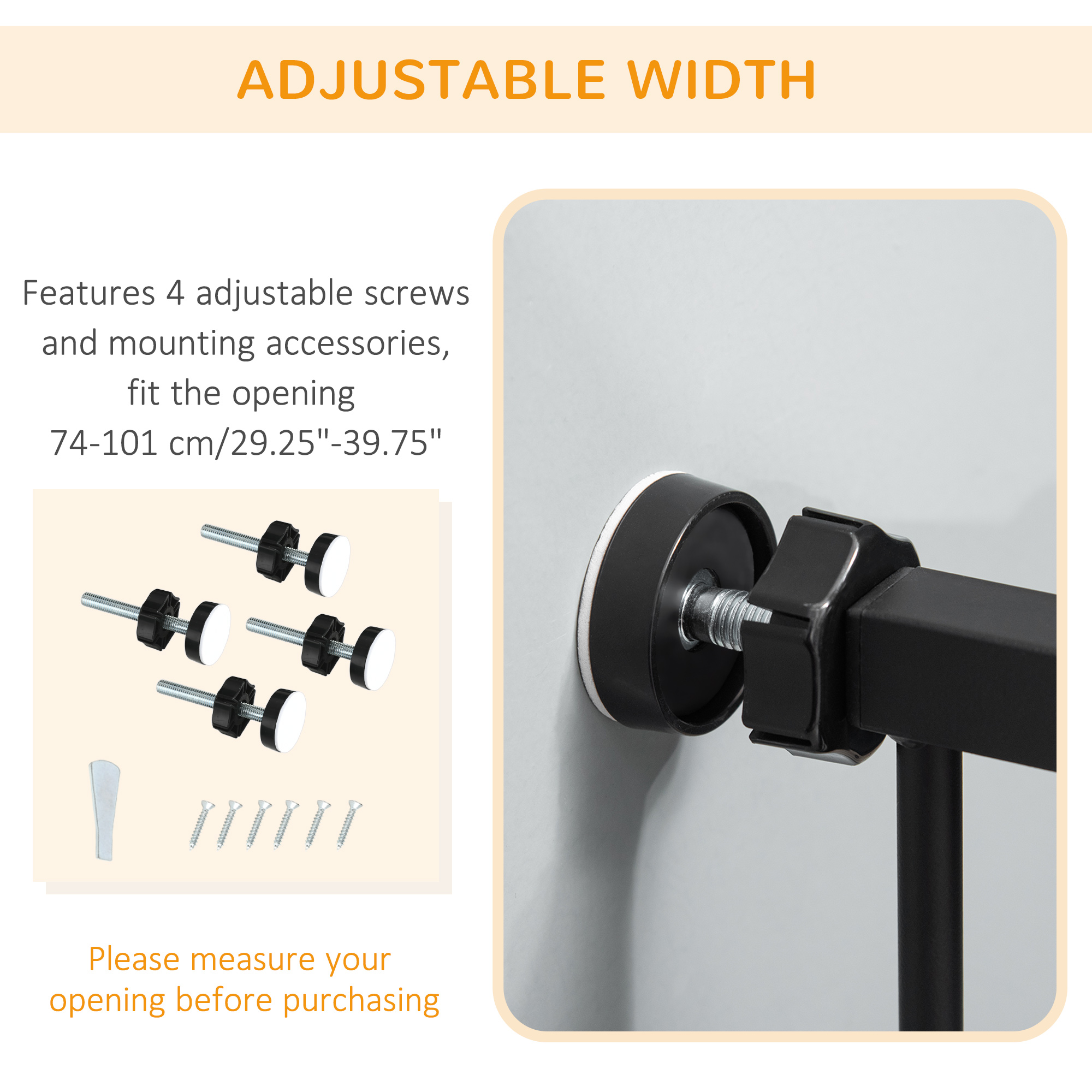 Keep pets away from rooms when required with this PawHut pet stair gate. Made from sprayed metal with lead-free treated surface for strength and safety. 74cm to 101cm wide, allows to fit into different sized spaces with ease while 104.1cm high - the extra tall gate makes it difficult for pets to get over. Slide and lift, the handle is easy to open, allowing you to pass through quickly without your pet escaping for security. Cat door provides a secure separation between cats and dogs.