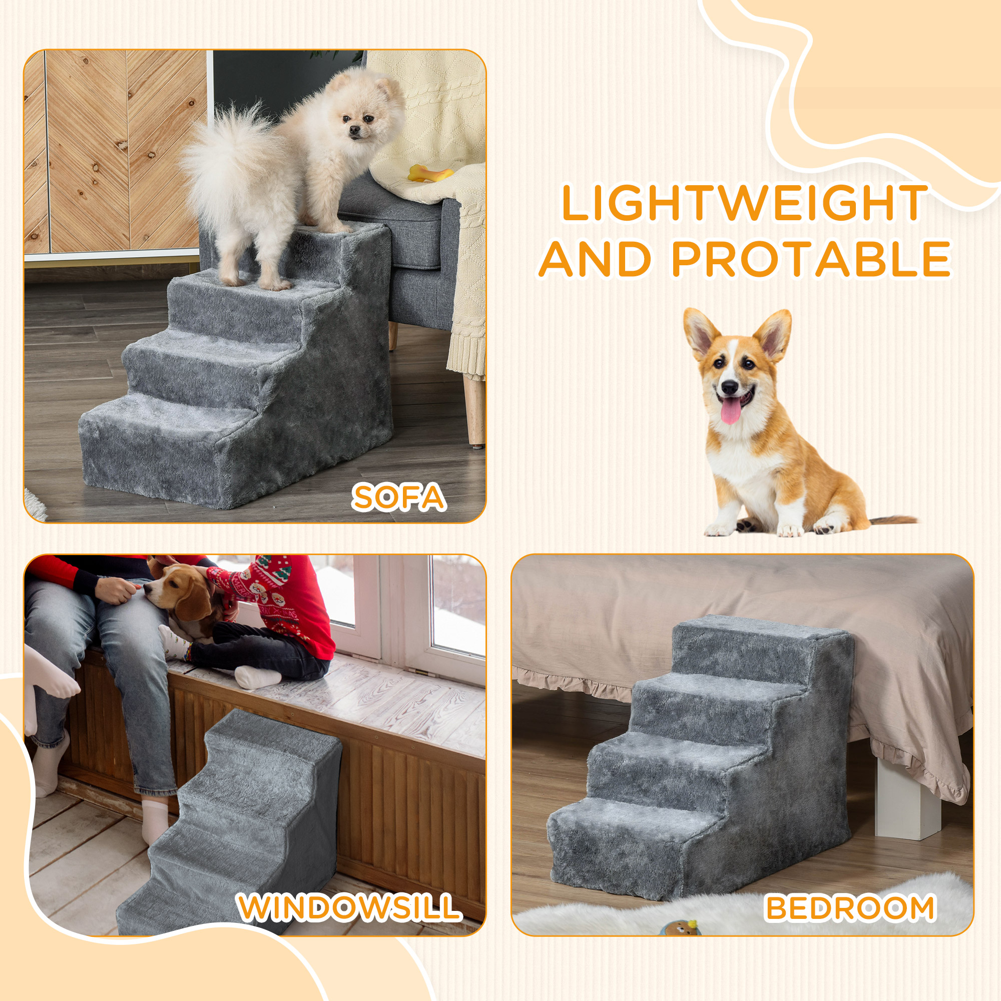 It has never been easier for pets to reach their favourite spot, thanks to these PawHut pet stairs. Four wide steps for gentle support, it spares their back and joints from any harm. Suitable for ageing companions and those with limited mobility, they'll feel the soft, warm plush material on their paws. Lightweight and portable, you can move the stairs to wherever they're needed most. Don't deny your pets the joy of their favourite places - provide them with easy access and comfort.