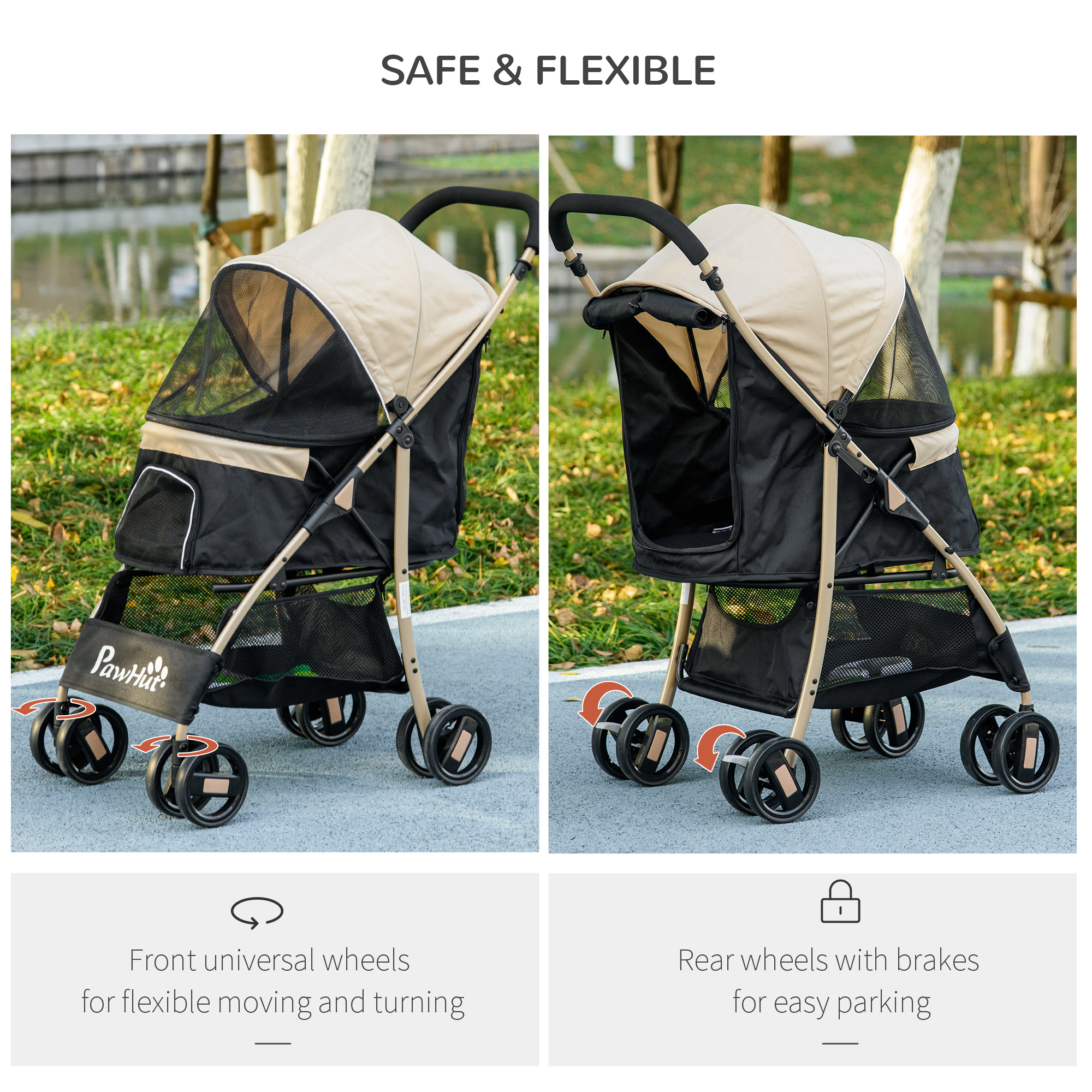 Enjoy outdoor adventures with your dog using PawHut's wonderful pet stroller. Designed for safety and comfort, it features smooth wheels, a spacious mesh-top basket and a three-level canopy for shade. The bottom basket and zipped pouch are for taking essentials on the go, whilst the rain cover prepares you for unpredictable weather. Ensure your pet's joy and security on every outing, making travelling that much better.