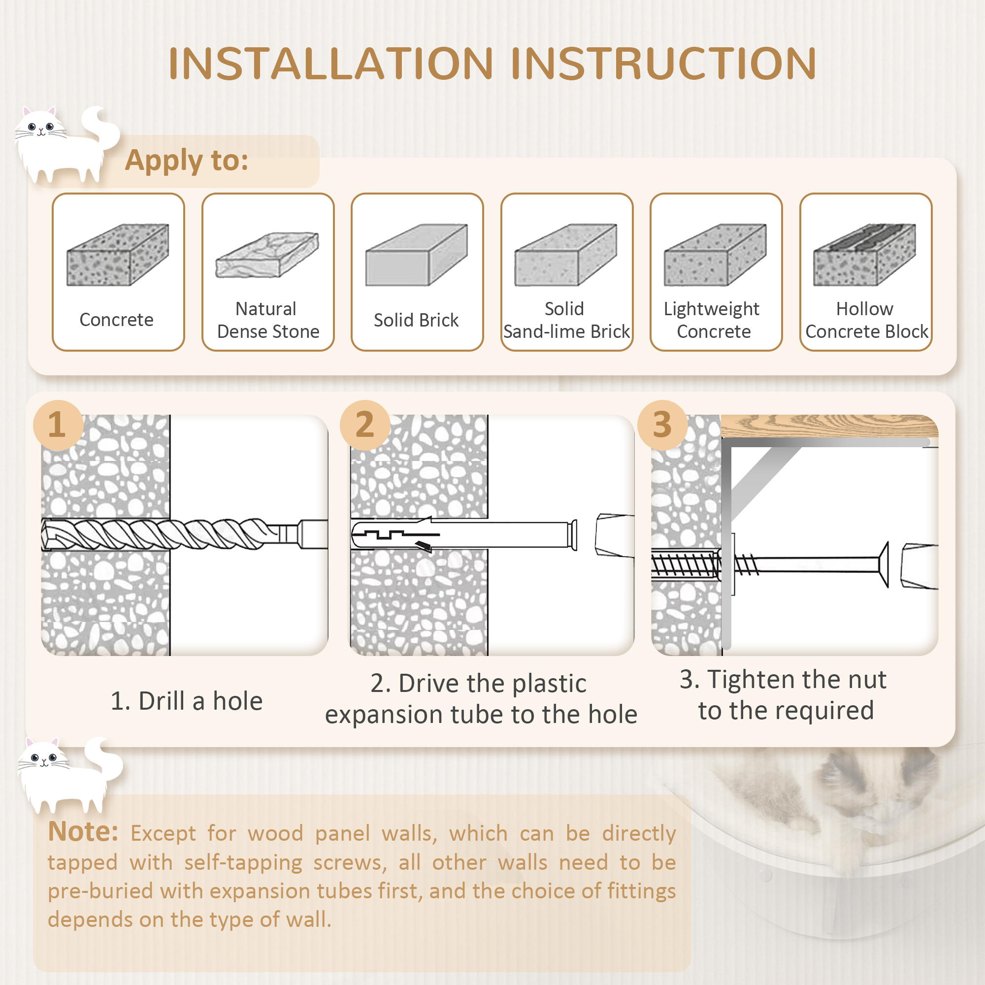 Rattle up your pet's thirst for curiosity and adventure with this cat wall shelves from PawHut. Made from MDF which steadily holds up to 4.5 kg in weight, this cat wall bed is crafted into a curved design to allow them to rest peacefully and prevent them from falling off, with a Berber fleece covering for comfort and warmth. Wall mountable in design thanks to the attachment board below the shelf, it comes complete with all the required accessories to set up.