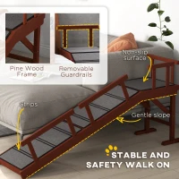 Give your furry friend an easy ascent with the PawHut dog ramp. Our dog and cat ramp ensures smooth and secure ascent to beds, sofas, and other furniture. It features four removable guardrails for added safety and a gentle 20° slope with six stripes. Crafted from pine wood and equipped with a non-slip carpet surface, our dog ramp for the couch is great for dogs under 66 lbs., especially older pets.