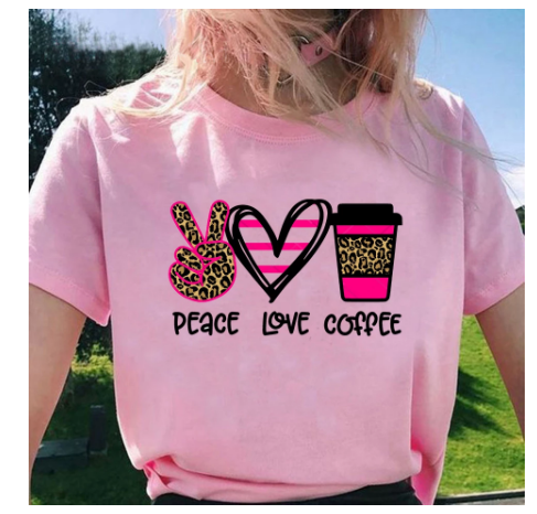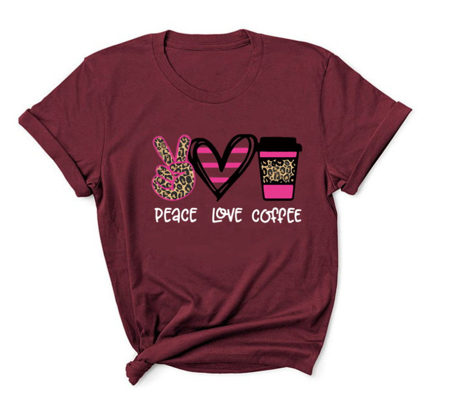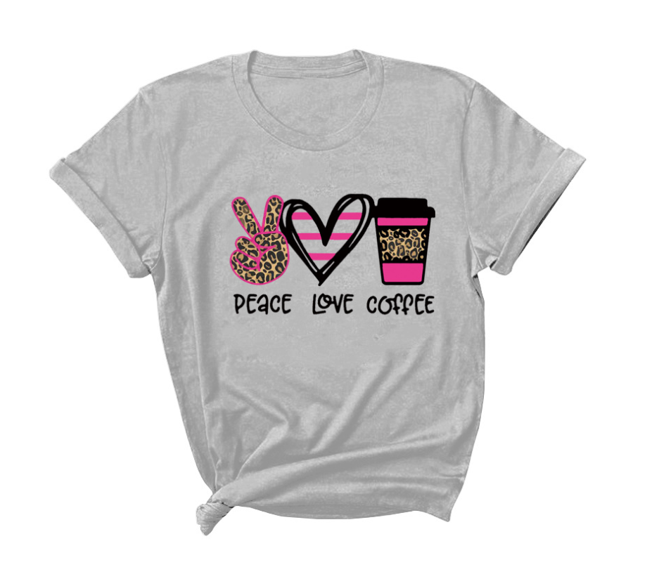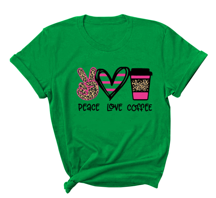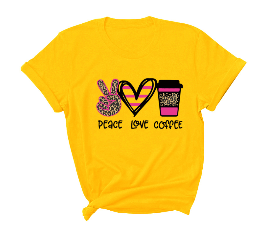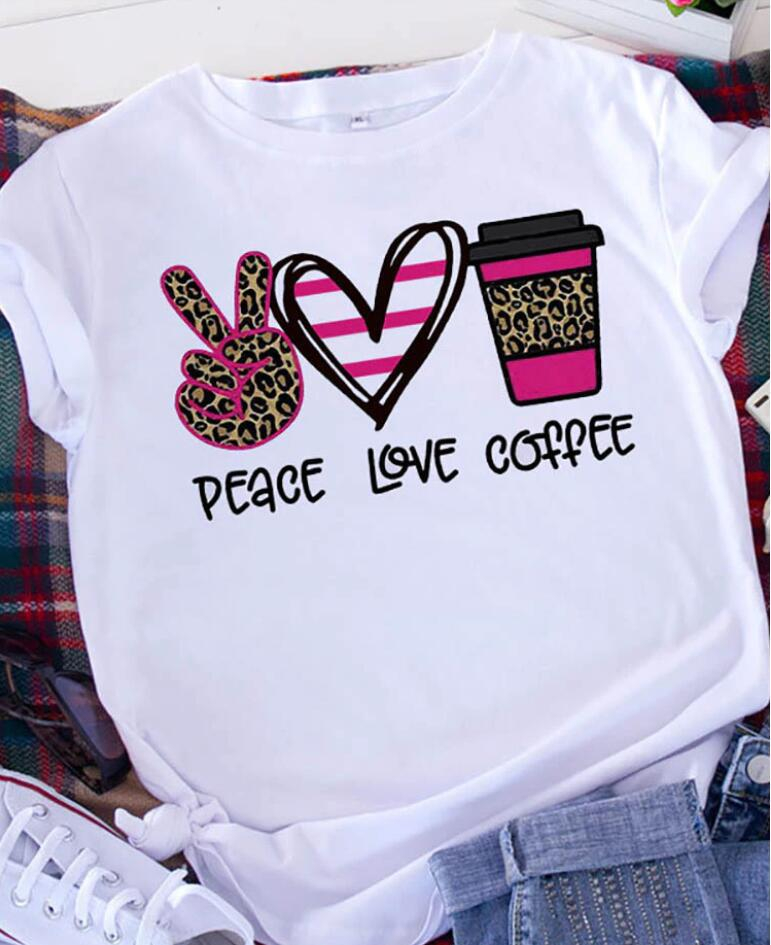 Peace Love Coffee Print Short Sleeved Round Neck T Shirt