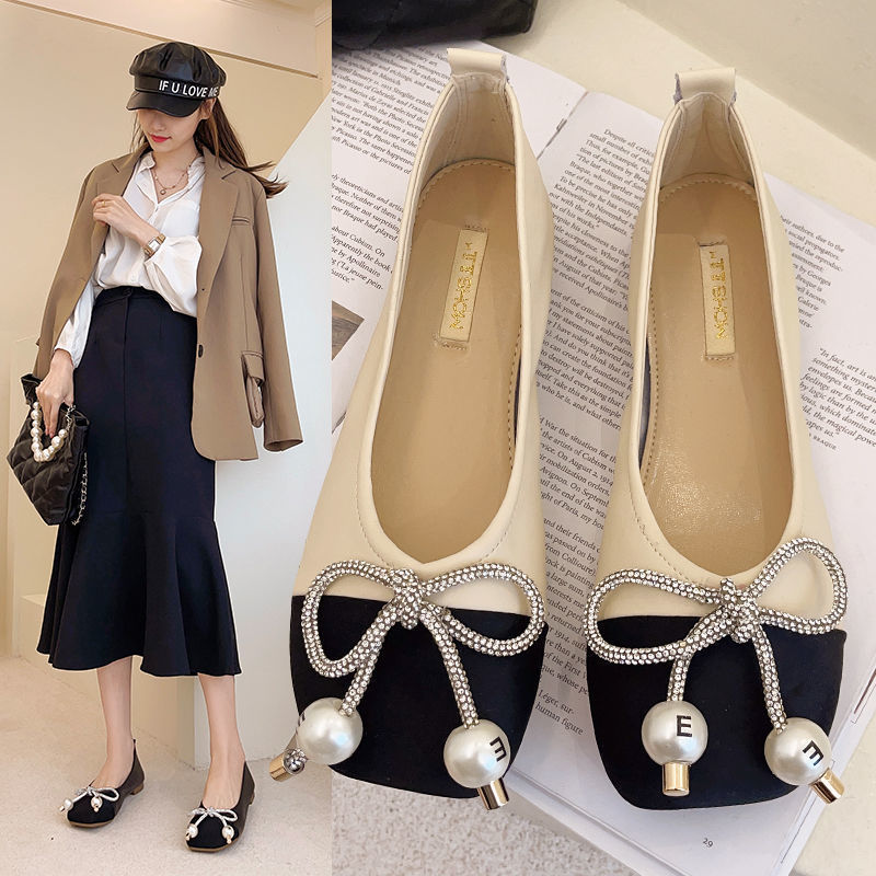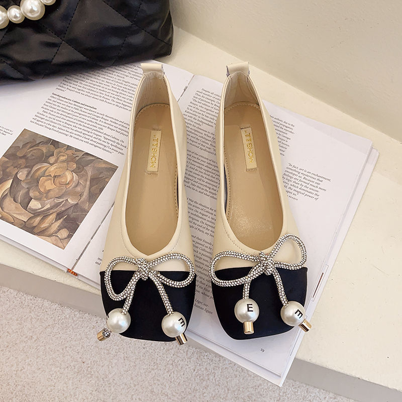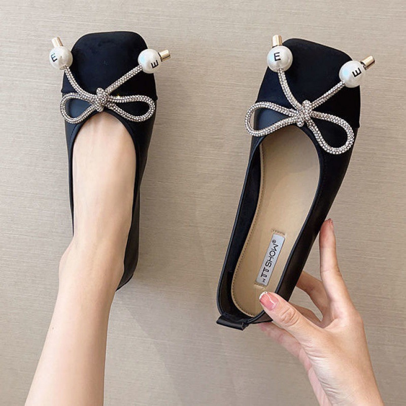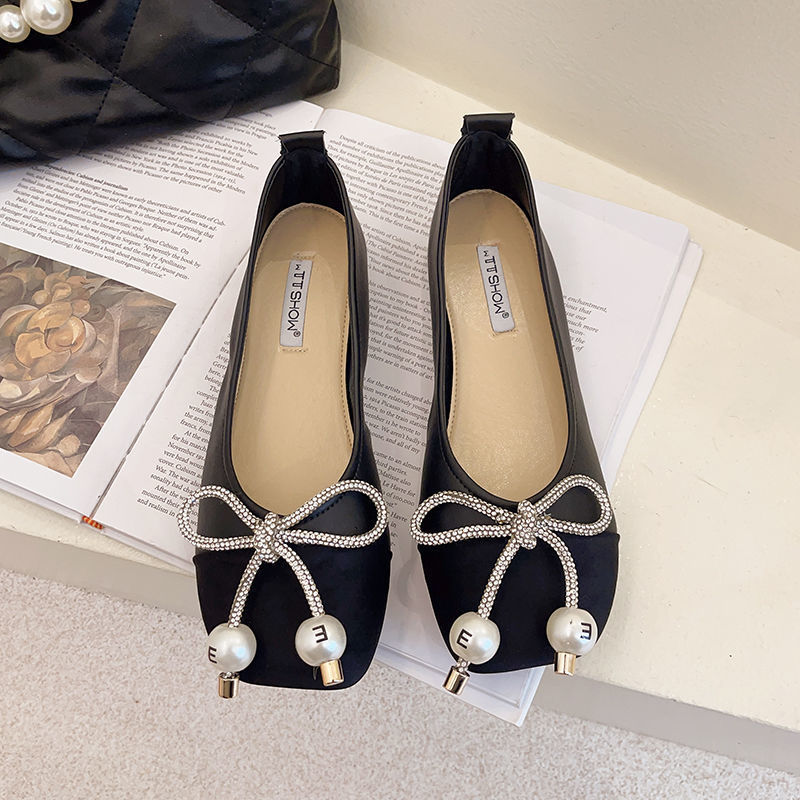 Pearl Bowknot Square Toe Flat Shoes With Soft Sole