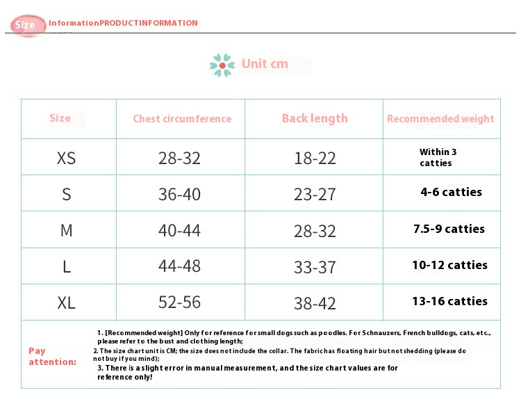 Size: XS-about 1.00 kilograms-1.50 kilograms, S-about 2.00 kilograms-3.00 kilograms, M-about 3.50 kilograms-4.00 kilograms, L-about 5.00 kilograms-6.00 kilograms, XL-about 7.00kg-9.00kg