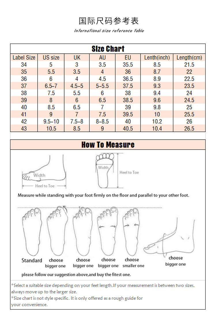 Size: 34, 35, 36, 37, 38, 39, 40 (customized non-refundable), 41 (customized non-refundable), 42 (customized non-refundable), 43 (customized non-refundable)