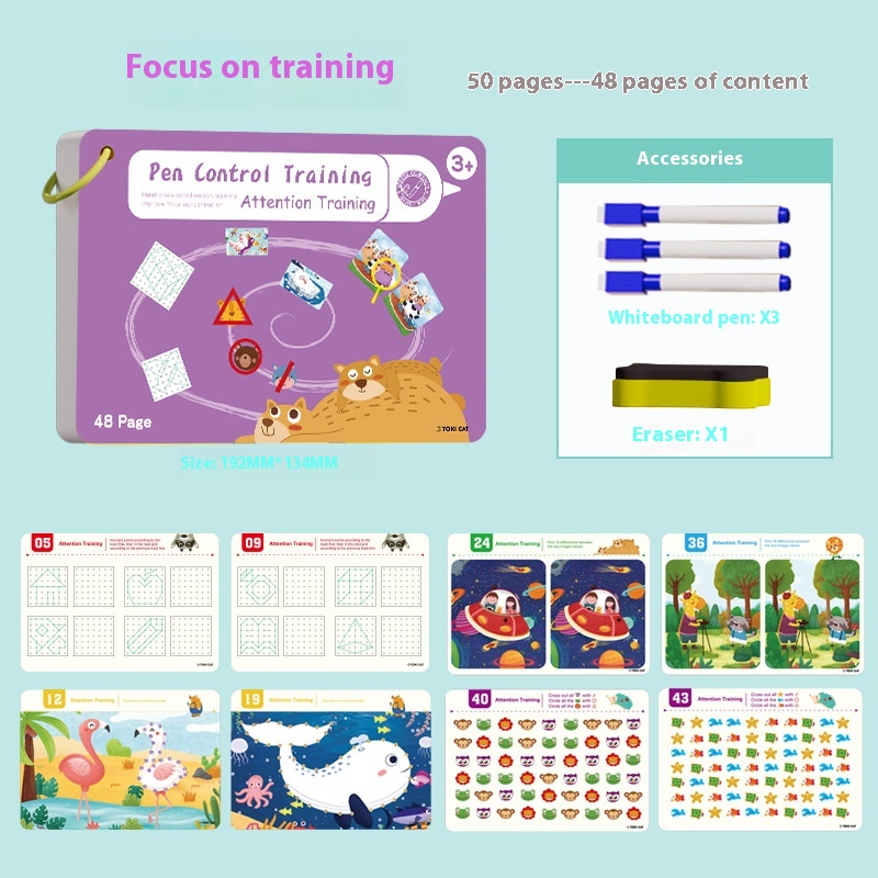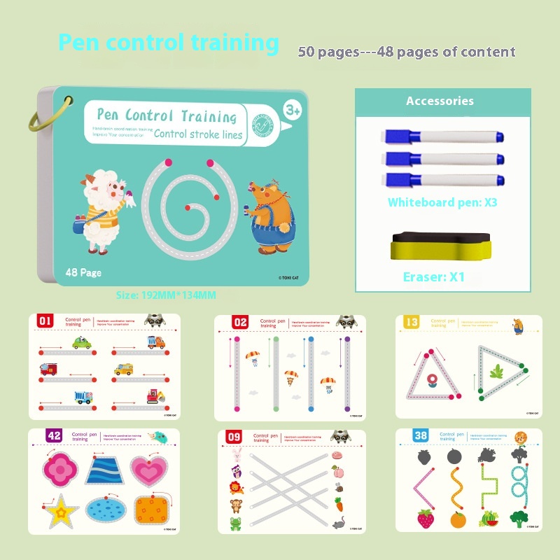 Color: pen control training 50 pages 25 pages 3 Pens 1 Wipe, thinking training 50 pages 25 pages 3 Pens 1 Wipe, key training... 50 pages 25 pieces 3 Pens 1 brush color box type pen control training... 50 pages 25 pages 3 Pens 1 writing brush, color box type pen thinking training... 50 pages 25 pages 3 Pens 1 Brush brush, color box style key training 50 pages 25 pages 3 Pens 1 Wipe, color box style number letter training 50 pages 25 pages 3 Pens 1 Wipe, no accessories... style optional..., accessories... 5 pens and 1 brush...