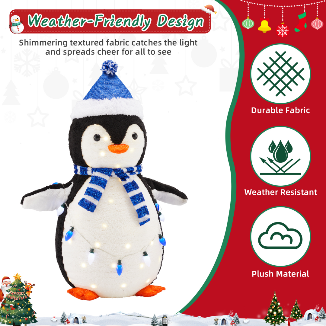 The pop-up Christmas decoration is made of shiny, textured fur-like fabric and supported by a durable powder-coated metal frame. This illuminated Christmas penguin is designed to withstand various outdoor elements, ensuring that your penguin family comes back season after season and looks as beautiful as on the first day.